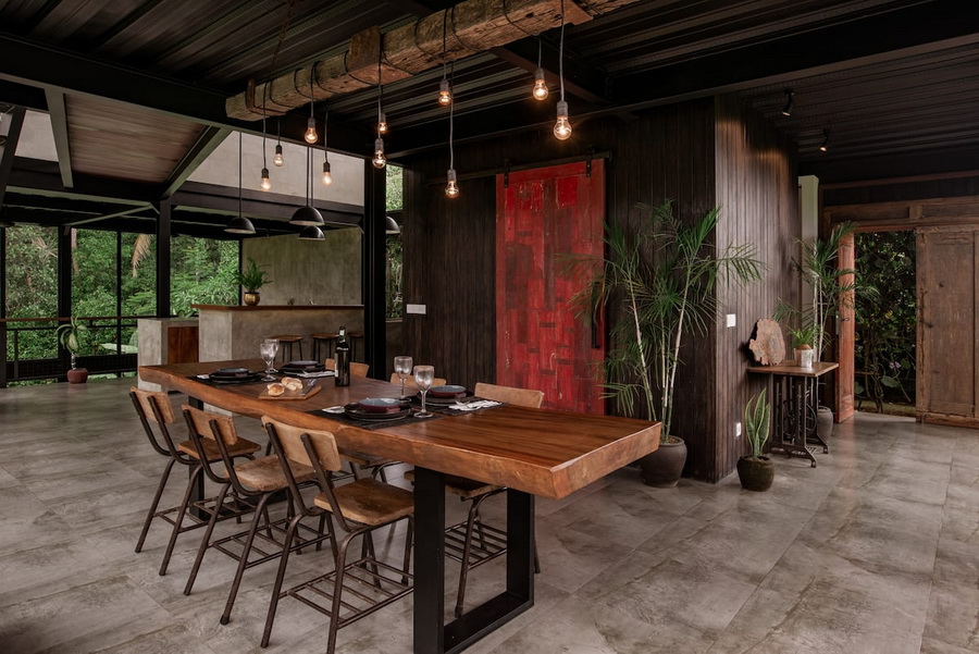 ถัดออกมาจะเป็นมุมโต๊ะรับประทานอาหารที่ออกแบบด้วยวัสดุจากไม้ ผสานการออกแบบในสไตล์อินดัสเทรียลแบบสวยดิบ จึงให้บรรยากาศที่พิเศษสุด ๆ