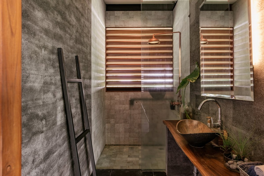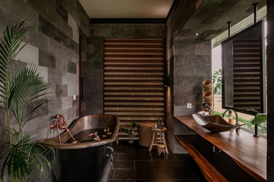 ห้องน้ำถูกตกแต่งในโทนสีที่ให้บรรยากาศแบบเคร่งขรึม ภายในมีสิ่งอำนวยความสะดวกอย่างครบครัน ทั้งยังมีหน้าต่างขนาดใหญ่ให้เราได้นอนแช่น้ำเคล้าบรรยากาศทุ่งนากันอย่างเพลิดเพลินอีกด้วย