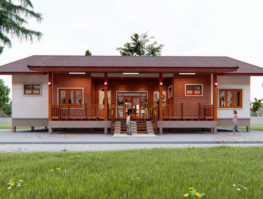 17. แบบบ้านชั้นเดียวยกพื้นโปร่ง สไตล์คันทรี 3 ห้องนอน 2 ห้องน้ำ พร้อมระเบียงพักผ่อนหน้าบ้าน