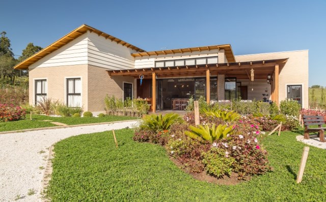ดีไซน์ตัวบ้านให้อยู่กลางสนามหญ้าสีเขียวสด ตกแต่งน้อยๆ ไปกับต้นไม้ใหญ่ ให้ร่มเงาแก่ต้วบ้านได้พอประปราย ใช้ทางเดินเข้า ผ่านสนามหญ้าเข้าสู่ตัวบ้าน มีพื้นที่พักผ่อนตามสวนหย่อม และใต้หลังคา เติมเต็มความต้องการของครอบครัวได้ครบครัน