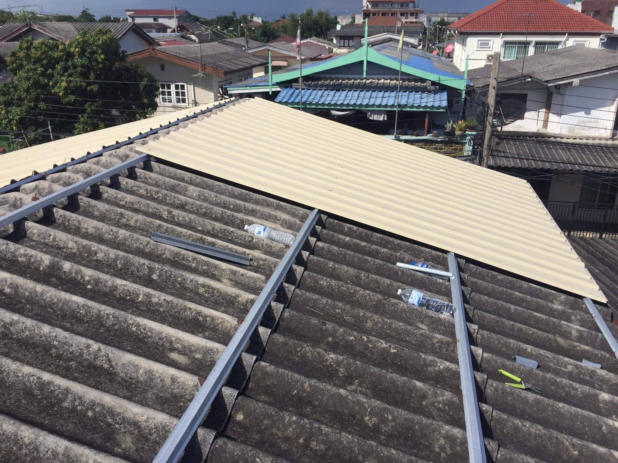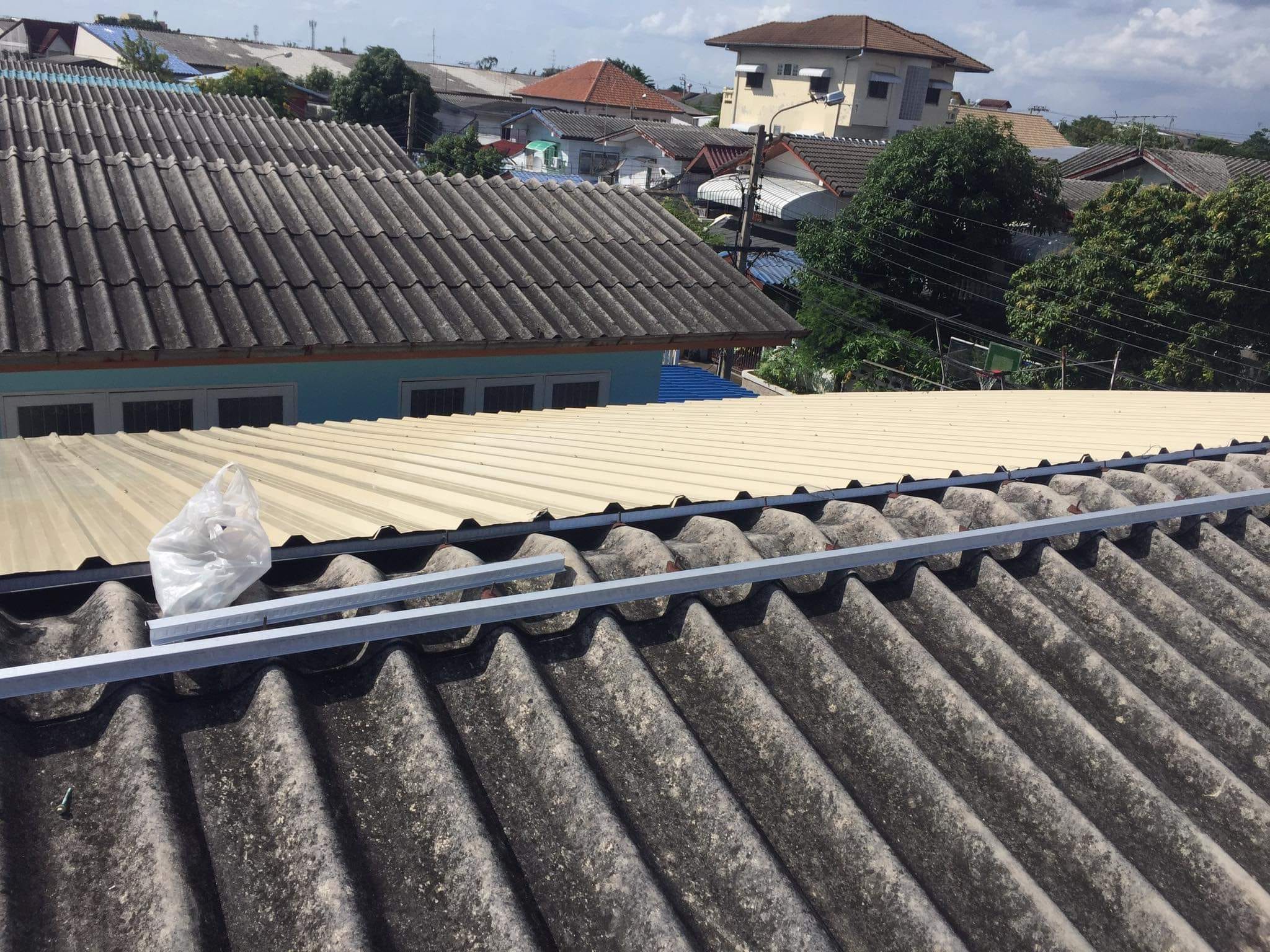 การติดตั้งก็จะทำการปูไปที่ละด้าน โดยจะปูแผ่นเมทัลชีทให้คลุมทั่วหลังคากระเบื้องอันเก่าเอาไว้