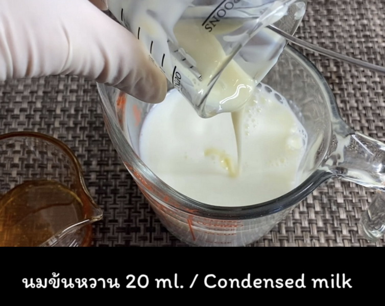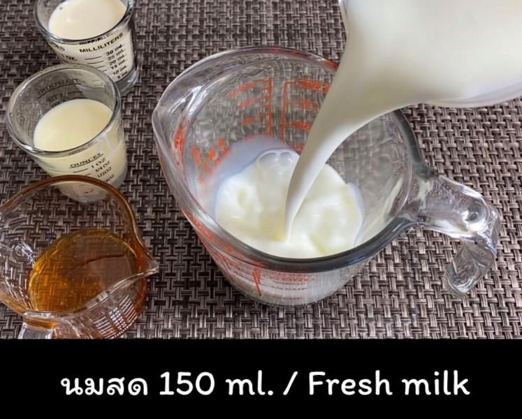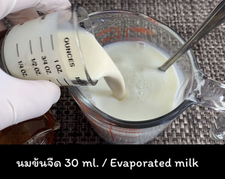 1. นมสด 150 ml. ผสมนมข้นหวาน นมข้นจืด คนให้เข้ากันดี