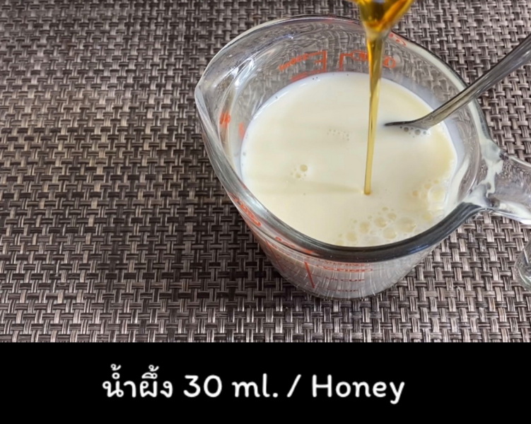 2. ใส่น้ำผึ้งลงไป แบ่งไว้แต่งแก้วนิดหน่อย เพื่อความสวยงาม (หรือจะไม่แบ่งก็ได้แล้วแต่ชอบ) ผสมให้เข้ากันอีกรอบ