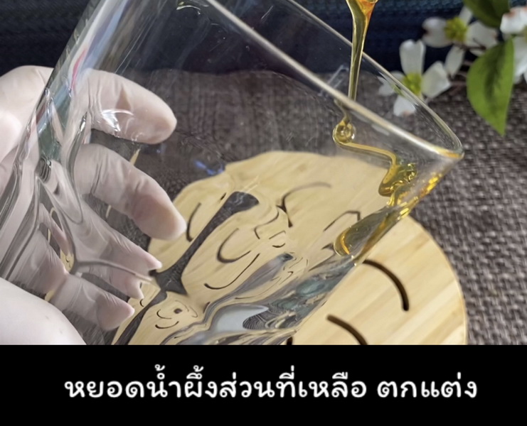 3. ค่อย ๆ ราดน้ำผึ้งส่วนที่เหลือลงไปตามขอบแก้ว ให้ทั่ว ๆ
