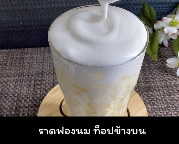 5. นมสด 50 ml. ตีฟองนมให้ขึ้นฟู ราดท็อปข้างบน เพื่อความน่ากินมากยิ่ง