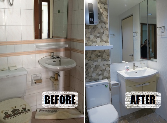 ให้ช่างตีราคา ทุบหมดทั้งห้องทำใหม่เหมือนในรูป ช่างคิด 25,000 บาท ฝ้าเพดา 5,000 บาท แฟนจะให้ย้ายเครื่องทำน้ำร้อนขึ้นไปใต้ฝ้า จะได้มองไม่เห็นเครื่อง (ประหนึ่งให้เหมือนโรงแรม) ช่างบอกต้องเดินท่อทองแดงขึ้นไป คิดอีก 5,000 บาท เลยบอกช่างว่า งั้นวางมันไว้ที่เดิมละกัน เปลือง 55