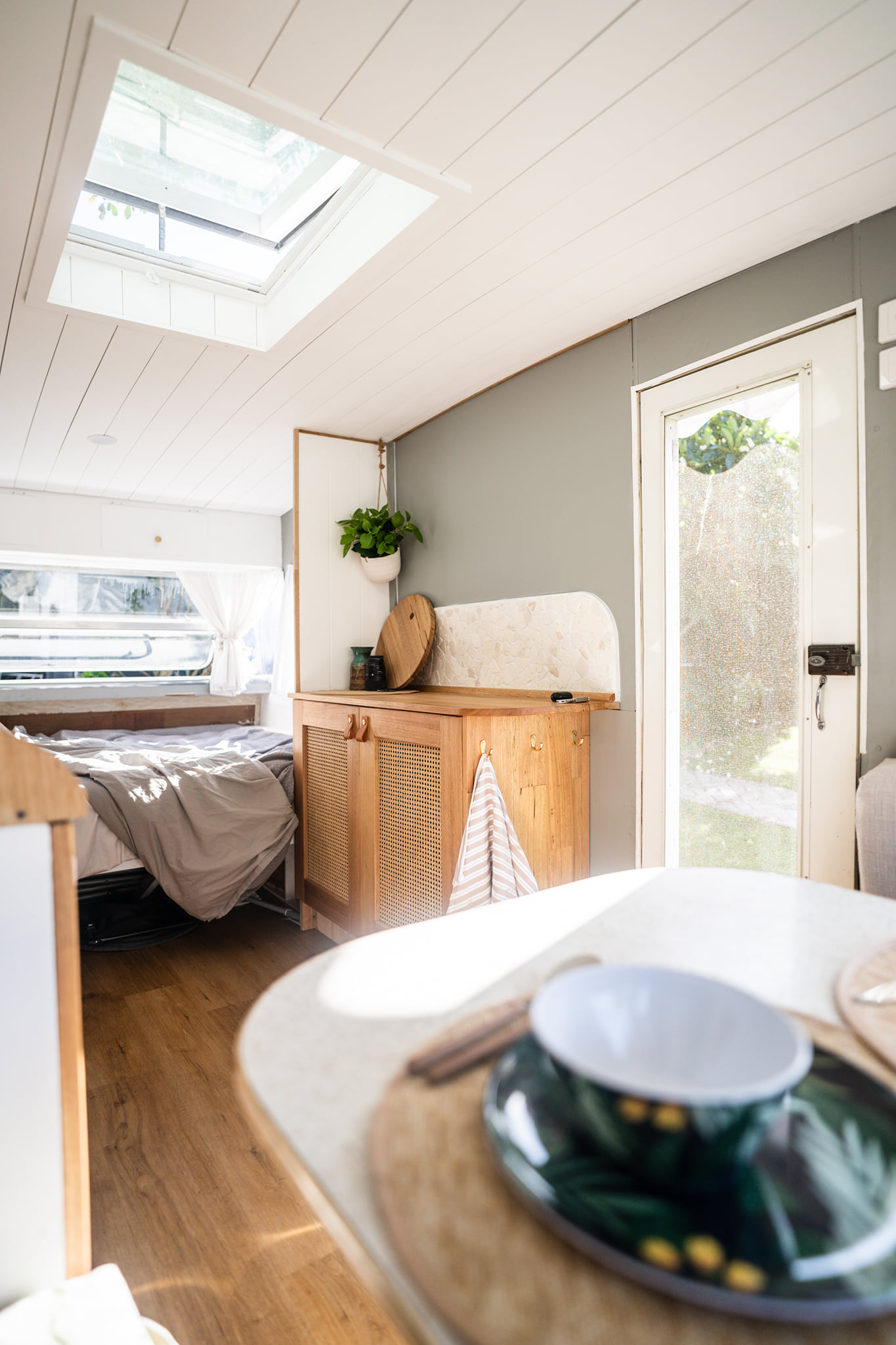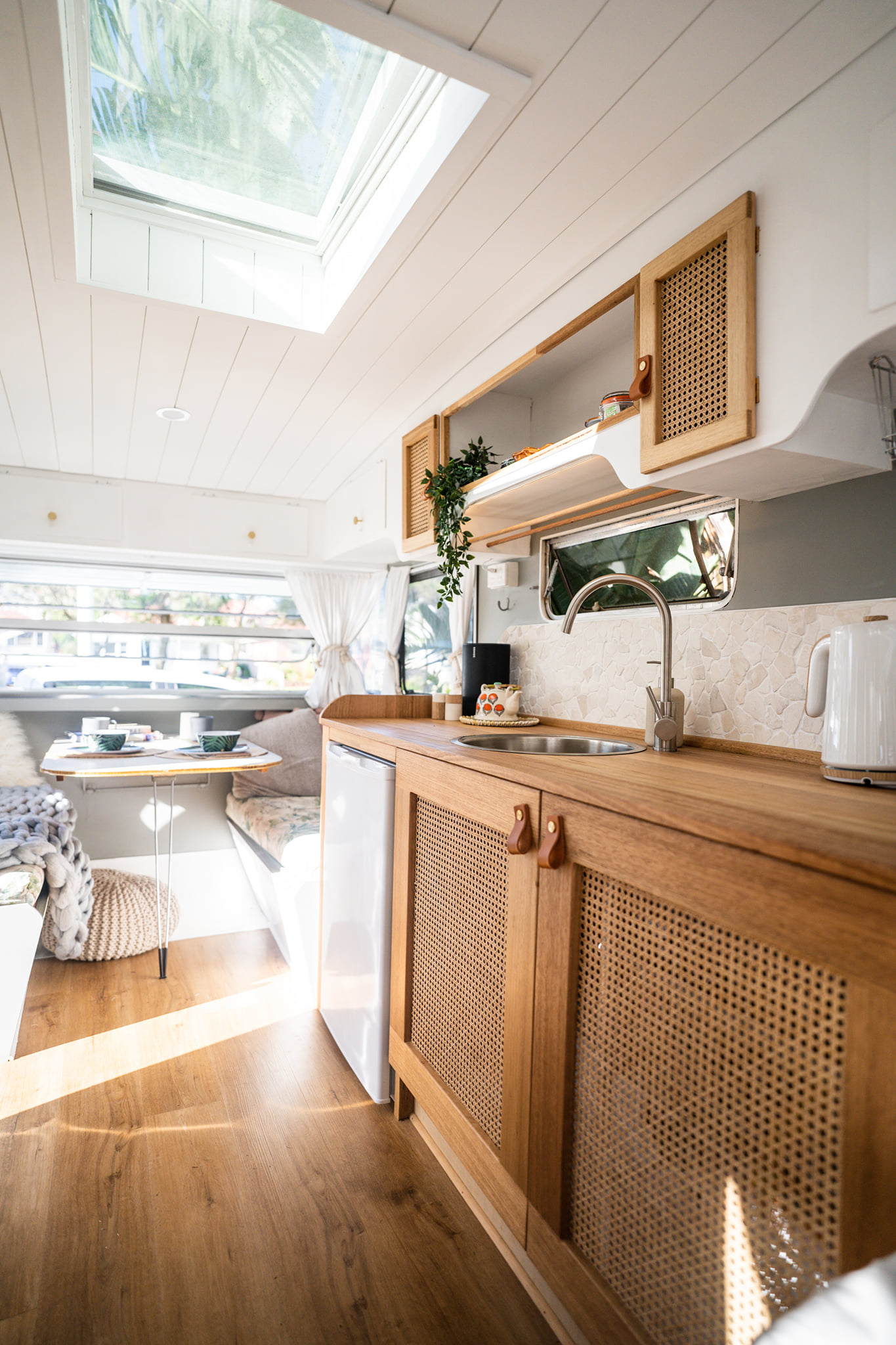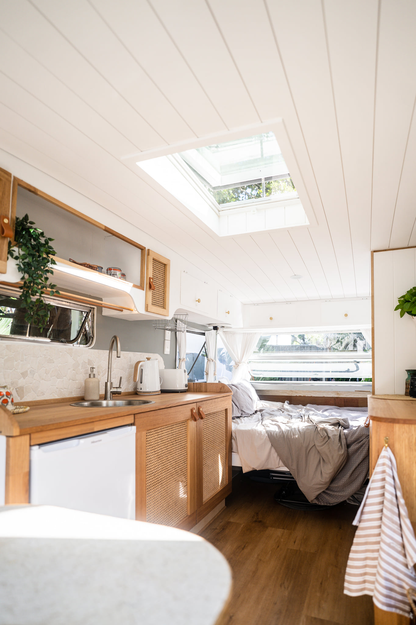 ภายในรถบ้าน จะมีพื้นที่ใช้สอยที่กำลังดี โดยเจ้าของบ้านตกแต่งภายในด้วยสไตล์แบบมินิมอล เน้นโทนสีอ่อนที่ให้บรรยากาศที่ผ่อนคลาย ช่วยลดความอึดอัดได้ดี