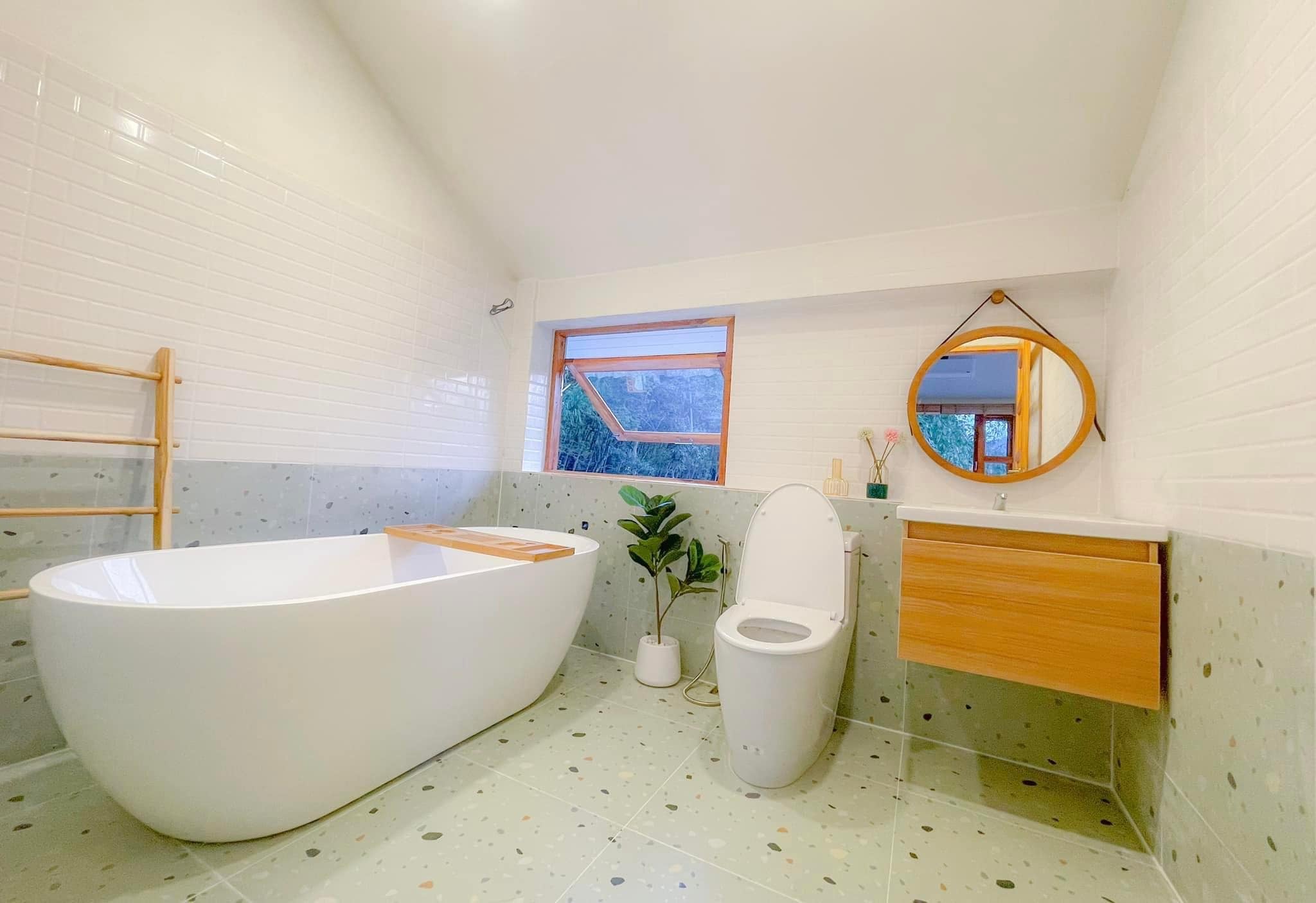 ภายในห้องน้ำก็ถูกตกแต่งได้อย่างน่ารัก มีพื้นที่กว้าง แถมยังมีอ่างอาบน้ำไว้ให้นอนแช่ตัวกันได้อย่างผ่อนคลายอีกด้วยนะ
