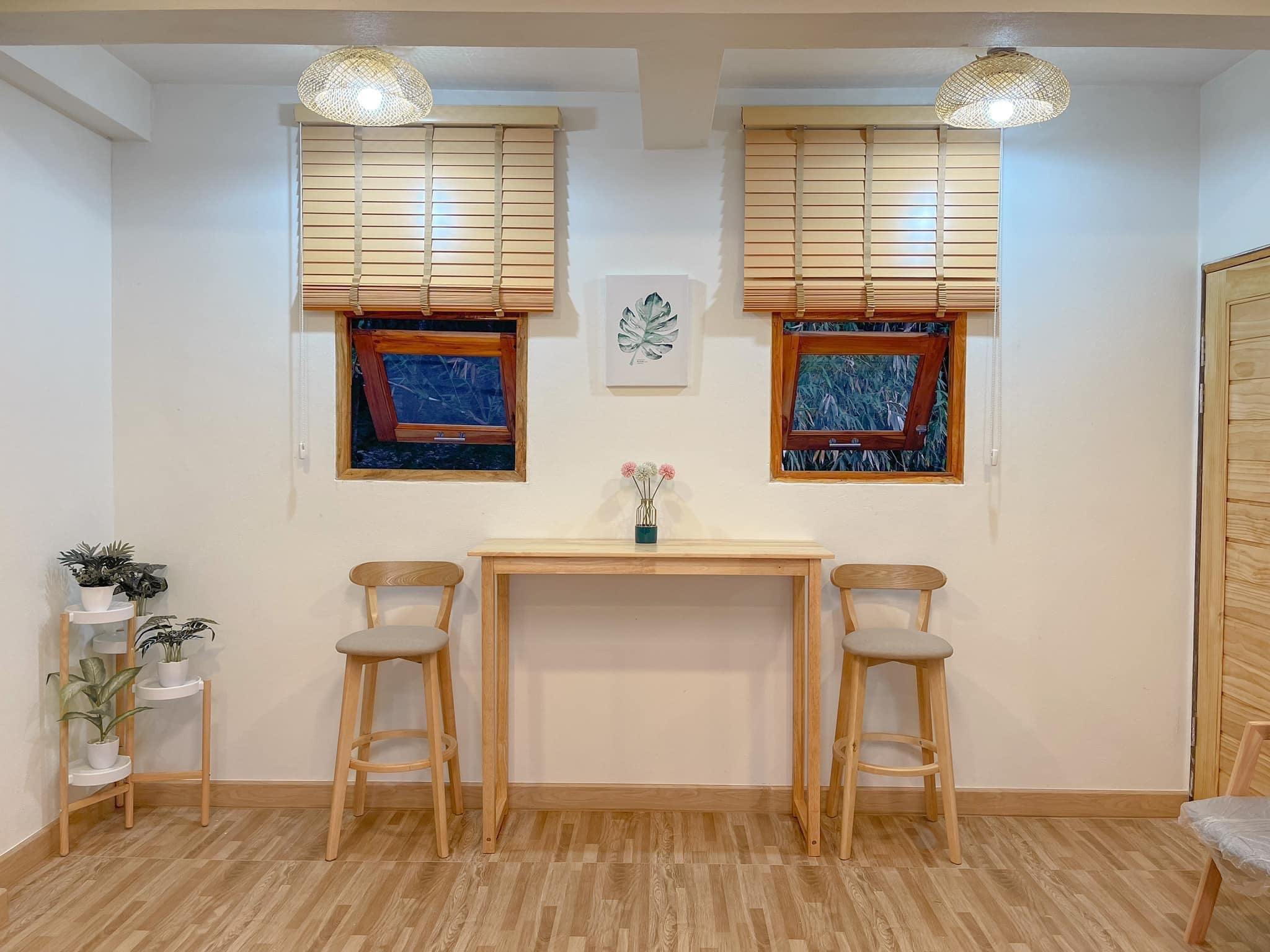 ภายในบ้านจะเน้นการตกแต่งด้วยเฟอร์นิเจอร์ไม้ในโทนีน้ำตาลเป็นหลัก พร้อมกับเพิ่มการตกแต่งด้วยสีเขียวที่ทำให้ด้านในสดชื่นไม่แพ้ด้านนอก