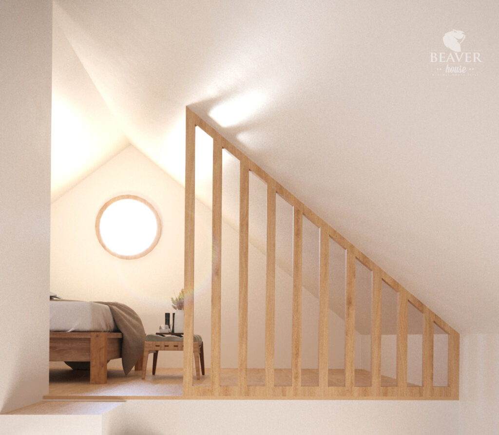 ห้องนอนตั้งอยู่บริเวณพื้นที่ใต้หลังคาที่มีขนาดเล็ก จึงไม่เหมาะสำหรับทำกิจกรรมอื่น ๆ นอกเหนือไปจากการนอนหลับพักผ่อน