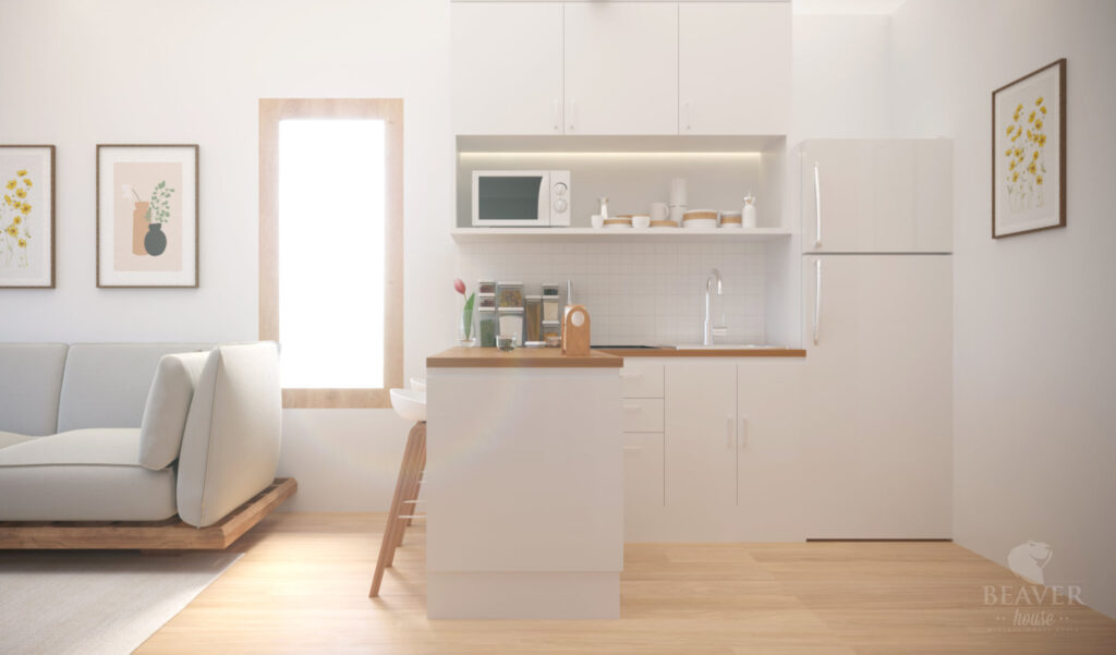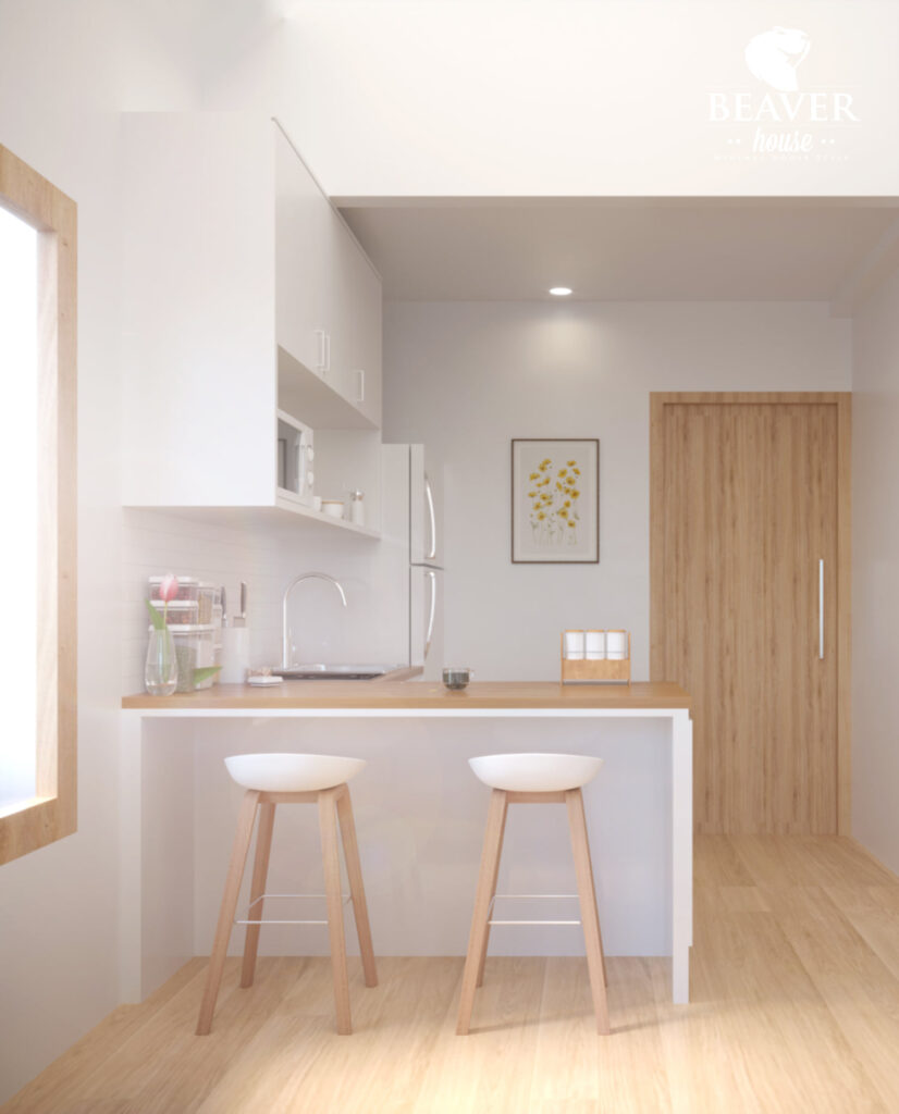 ห้องครัวในมุมเล็ก ๆ แบ่งจากพื้นที่โถงด้วยเคาน์เตอร์รูปตัวแอล ส่วนที่ติดผนังจะเป็นเตาทำอาหาร ด้านบนเป็นชั้นวางเอนกประสงค์ จึงมีฟังก์ชันการใช้งานที่ครบถ้วน