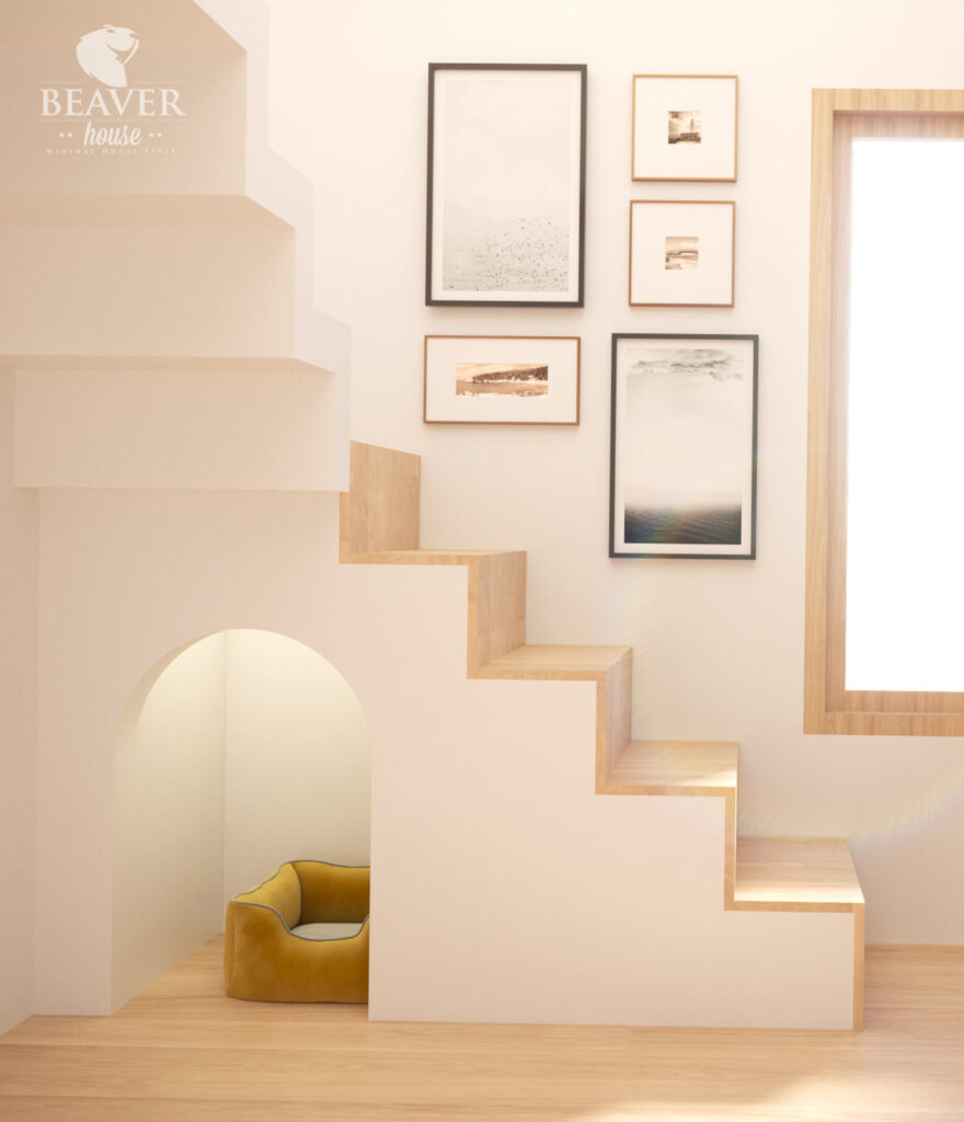 บันไดขนาดเล็กบริเวณนี้เป็นสิ่งที่จะนำเราไปสู่พื้นที่ของห้องนอนที่อยู่ด้านบน โดยพื้นที่บรริเวณใต้บันไดมีบ้านสำหรับสัตว์เลี้ยงซ่อนเอาไว้อยู่ด้วย