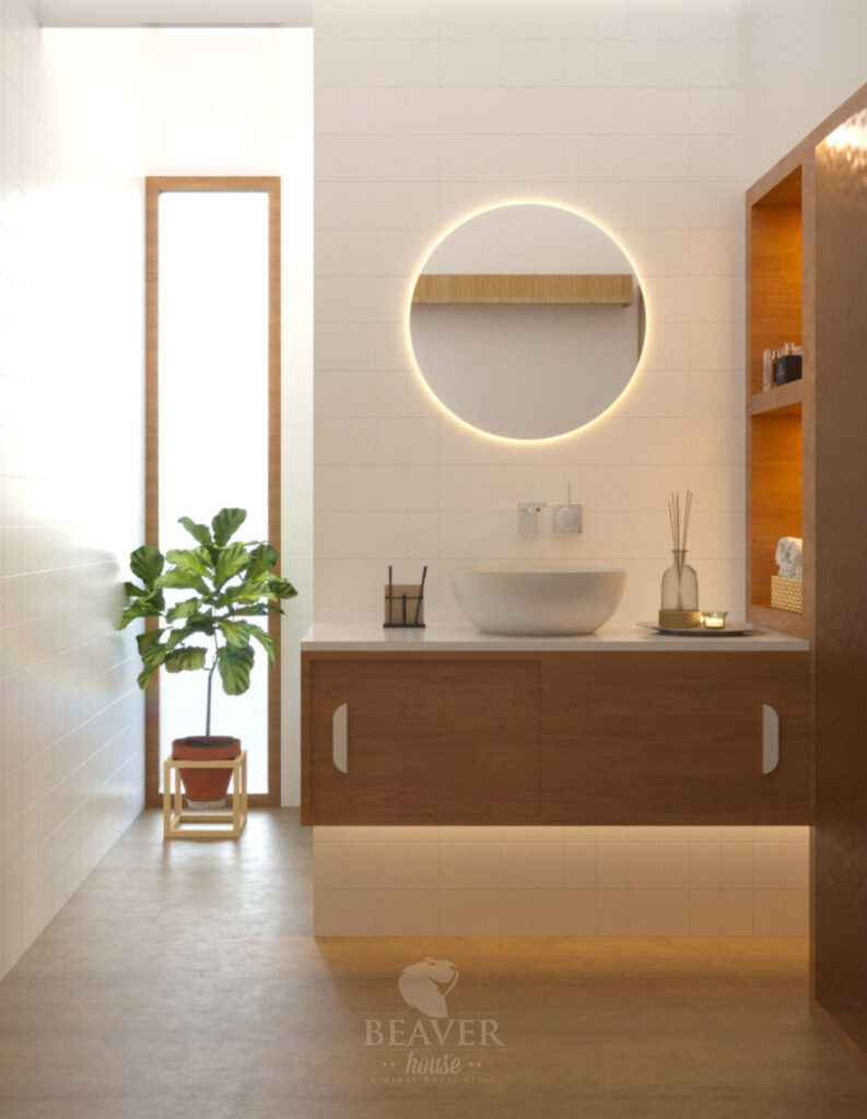 บริเวณอ่างล้างหน้าก็สูงออกแบบได้เป็นอย่างดี ให้ดีไซน์ที่สะท้อนความเป็นมินิมอลได้อย่างชัดเจน กระจกทรงกลมพร้อมไฟด้านหลังเป็นสิ่งที่สะดุดตาที่สุดของมุมนี้