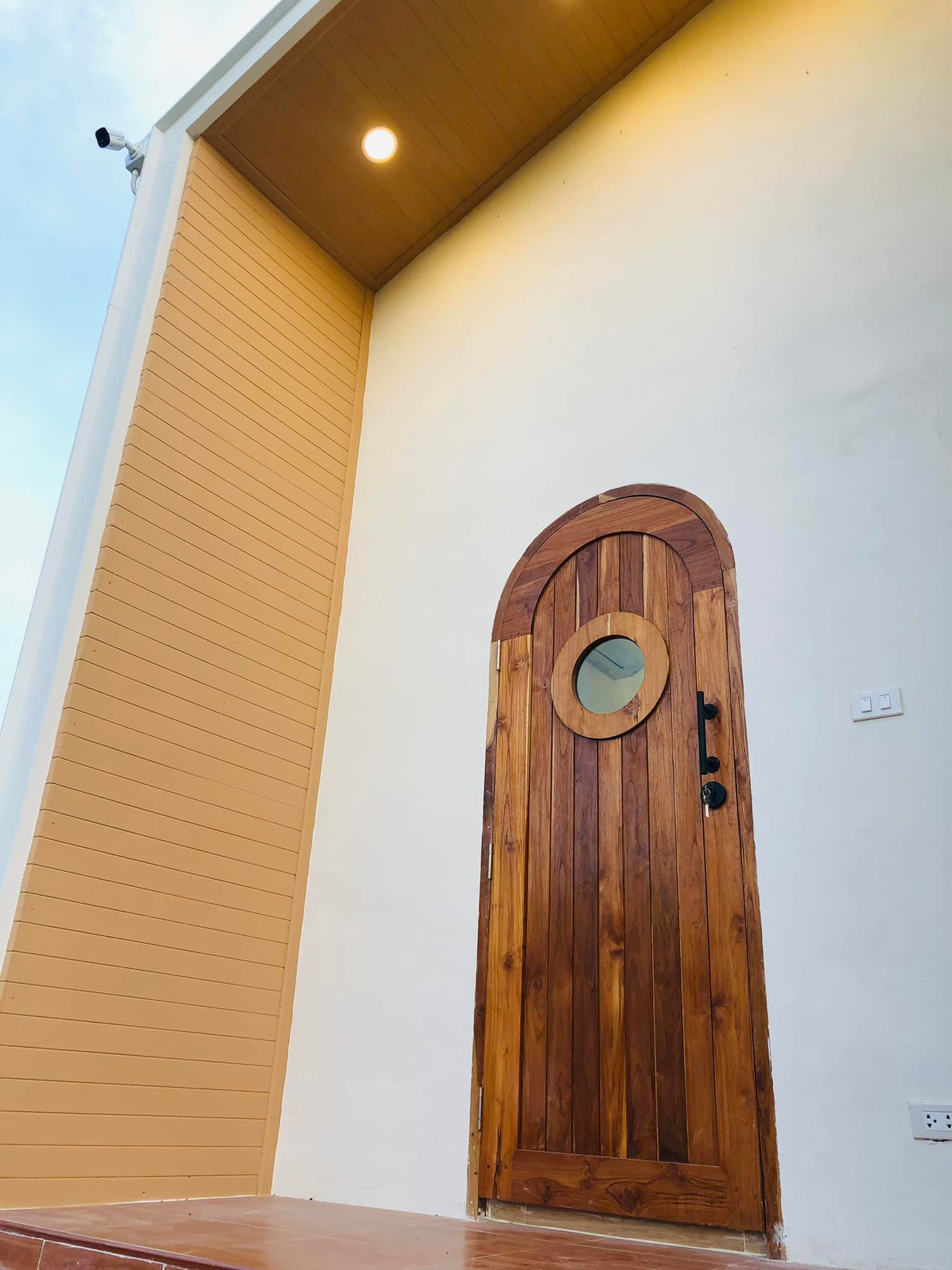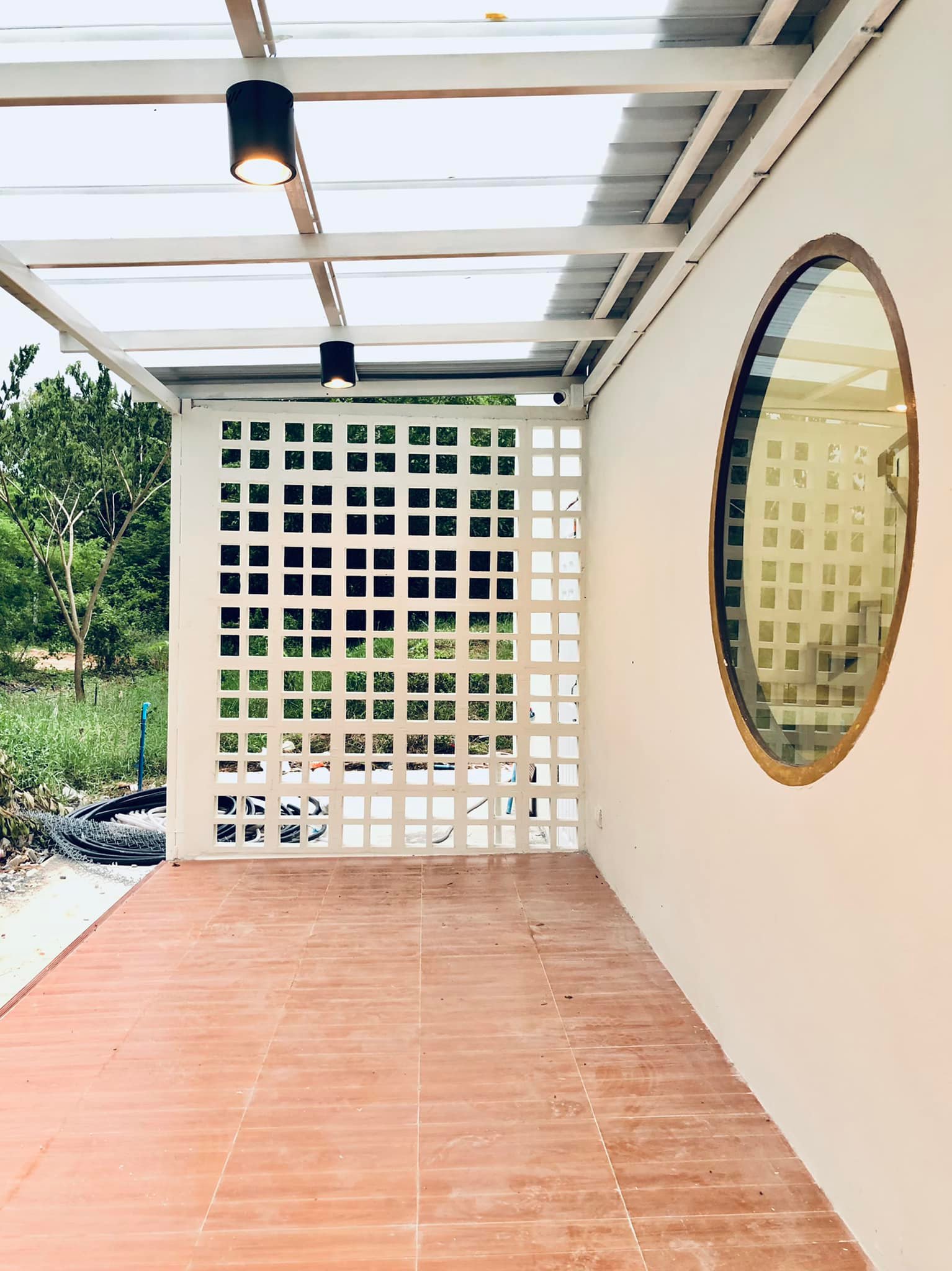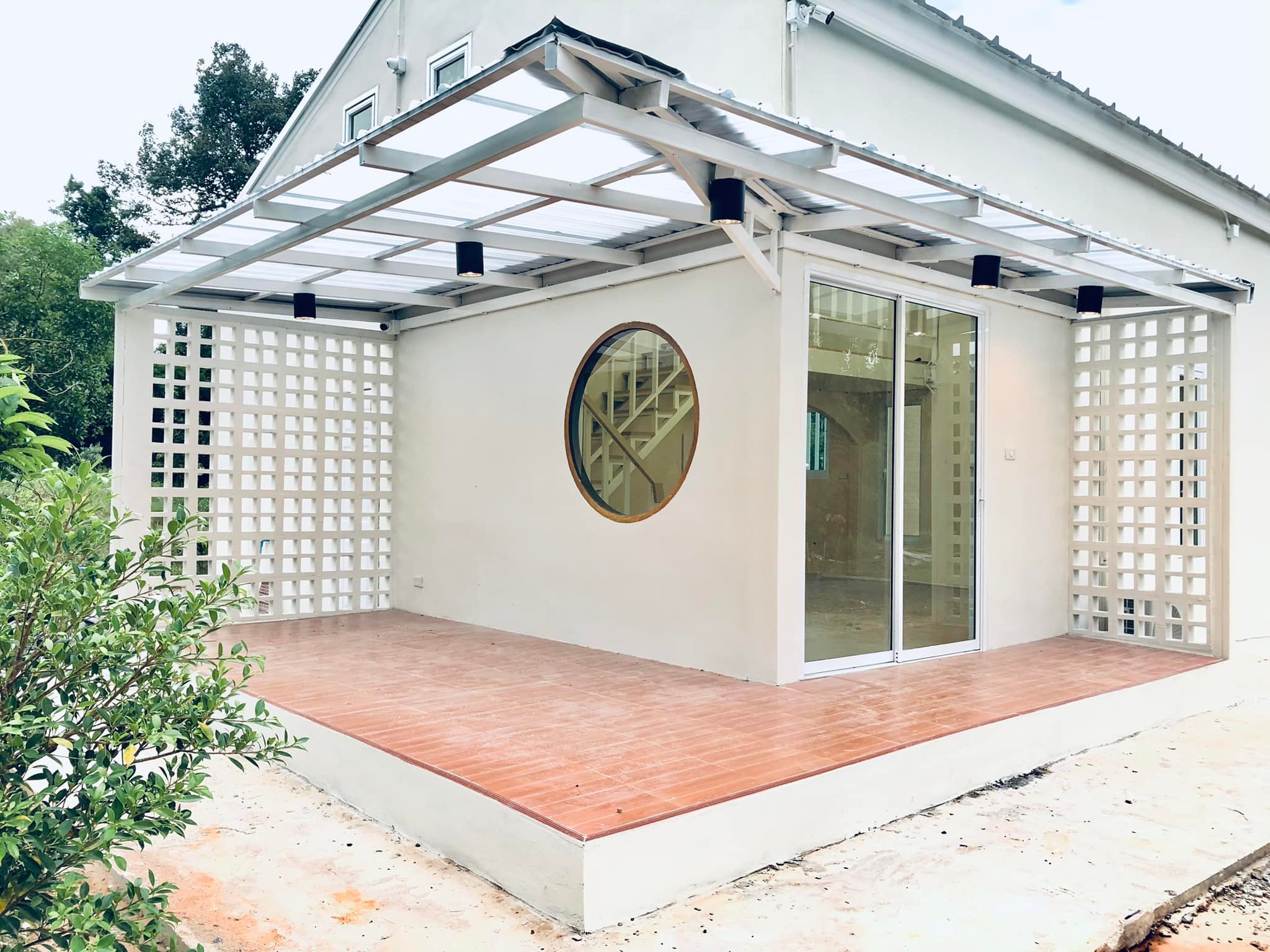 โดยหลังคากันสาดบริเวณเฉลียงแห่งนี้จะเลือกใช้หลังคาแบบสกายไลท์ จึงป้องกันแดดและฝนได้ดี แต่ก็ยังให้แสงปริมาณพอเหมาะกับเฉลียง
