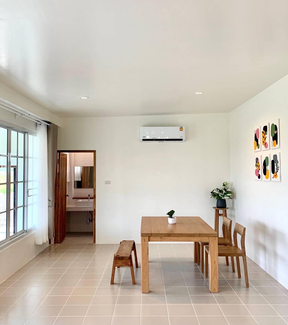 ไม่ไกลจากห้องนั่งเล่น ก็จะเป็นพื้นที่ห้องรับประทานอาหารที่ตกแต่งอย่างเรียบง่ายด้วยโต๊ะไม้ขนาดกำลังดี มีหน้าต่างบานใหญ่ที่ช่วยเพิ่มแสงสว่างให้พื้นที่