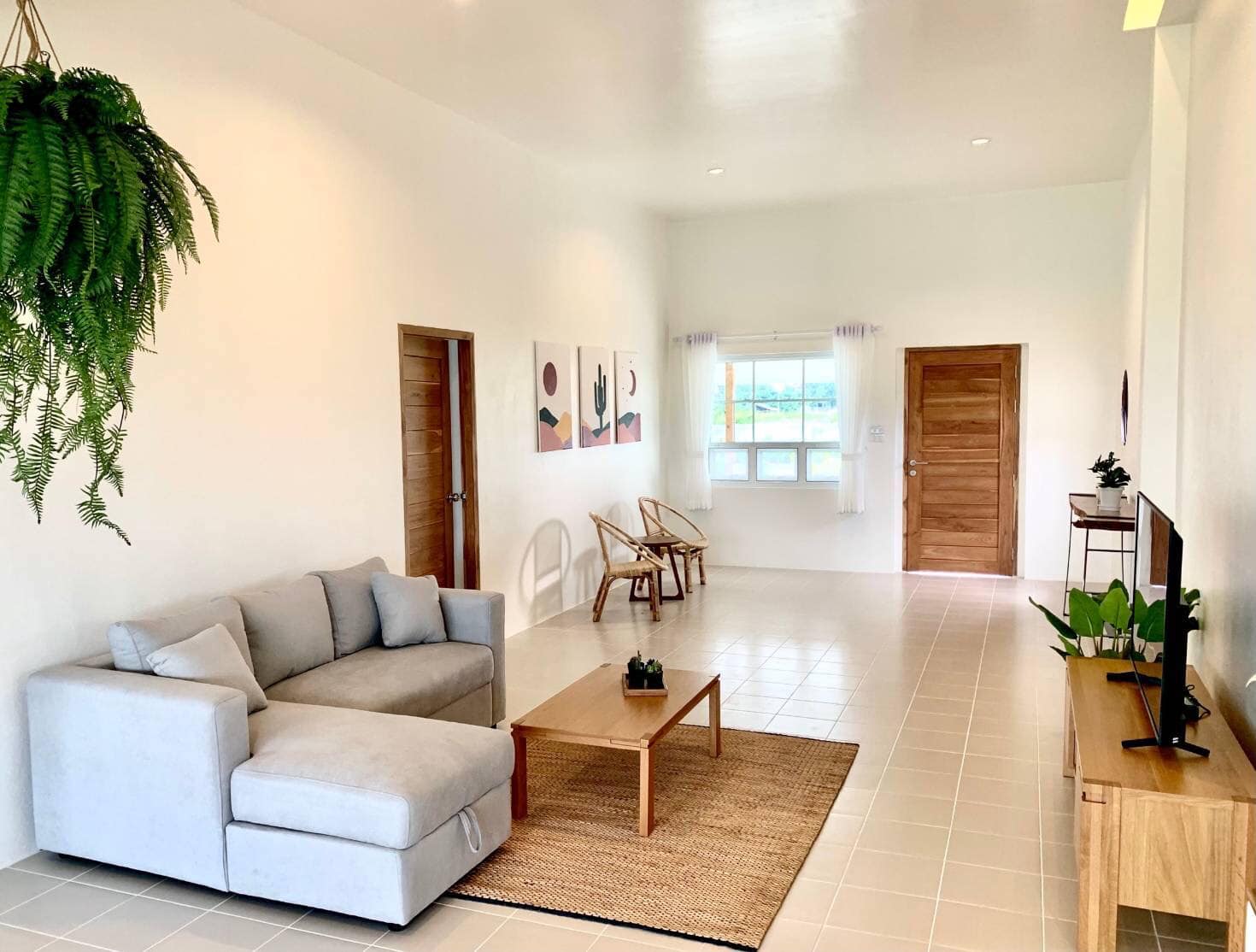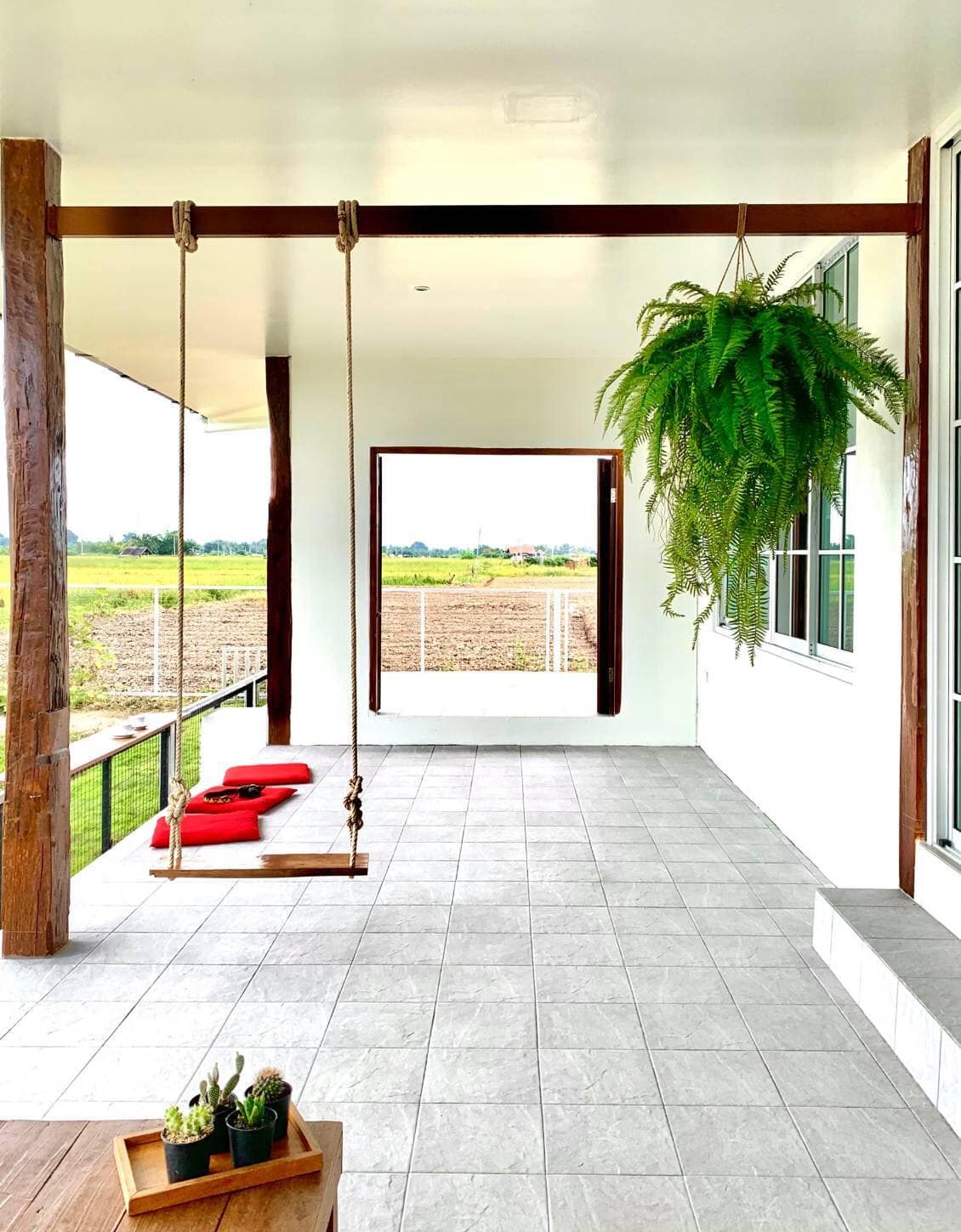 ถัดเข้ามาอีกนิดที่เฉลียงกว้างของบ้าน ซึ่งมีลักษณะที่เปิดโล่งในทุกมุม ถูกตกแต่งให้เป็นพื้นที่พักผ่อนในร่ม ซึ่งสามารถออกมานั่งเล่น มาเอนกายได้ตลอดทั้งวันเลย