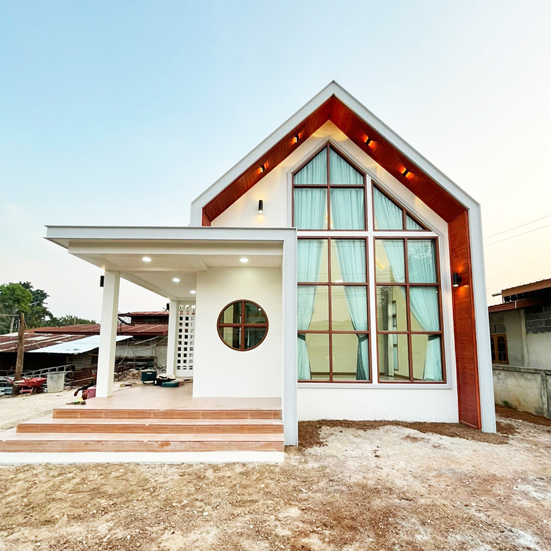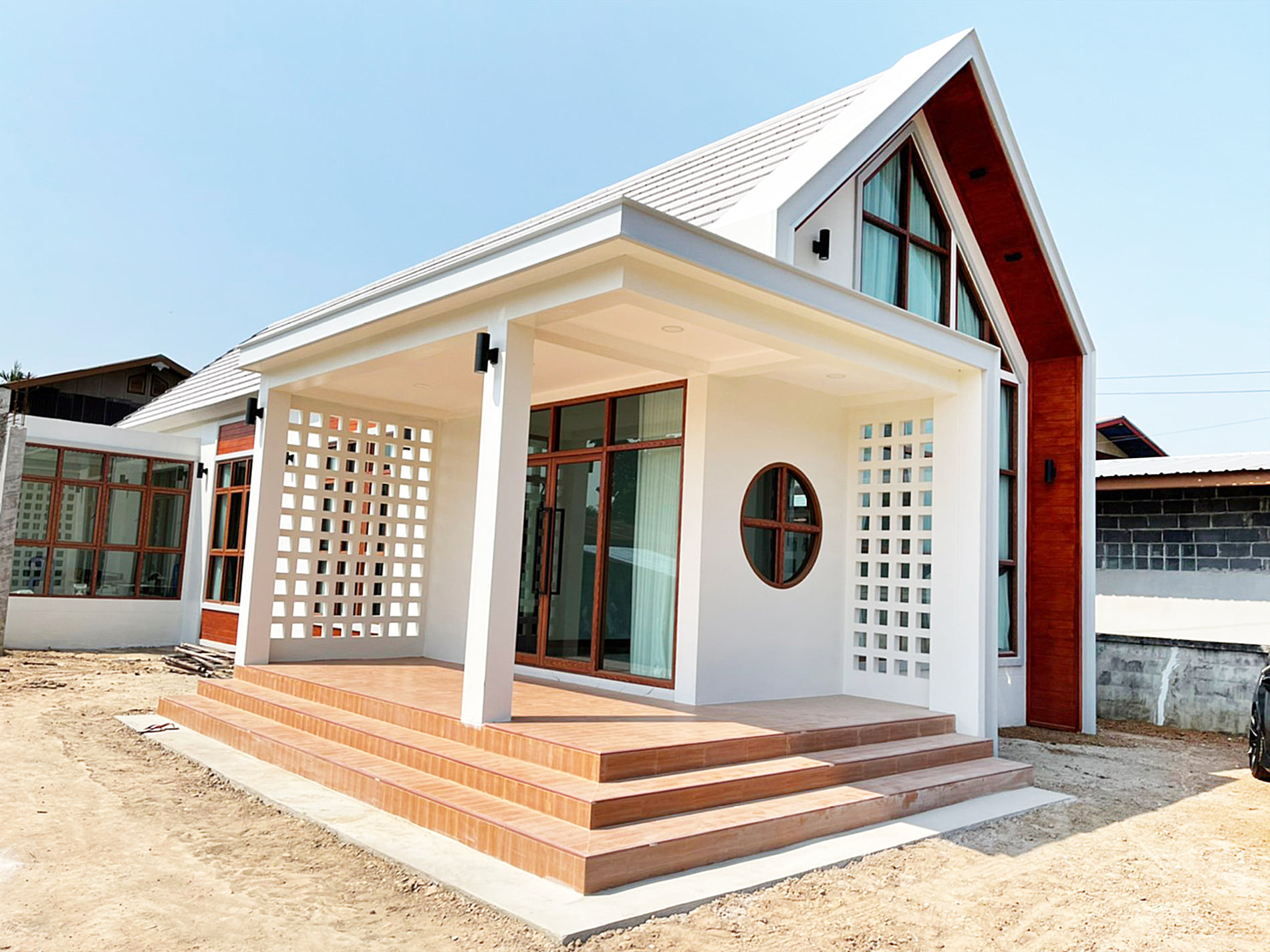 การตกแต่งนั้น ตัวบ้านจะมีโทนสีขาวครีมเป็นสีหลัก แซมด้วยสีน้ำตาลที่ทำให้บ้านดูมีลูกเล่นสวยงาม งานหลังคาจะเป็นหลังคาทรงแหลม ‘แบบเอ-เฟรม’