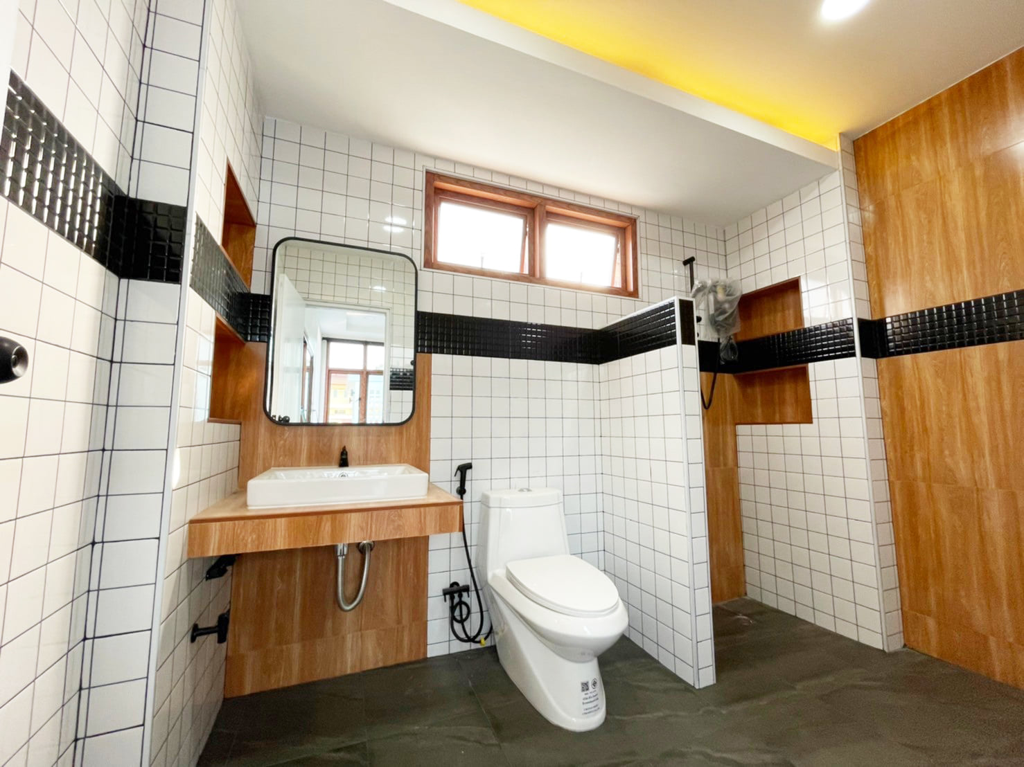 สำหรับห้องน้ำ ถูกตกแต่งอย่างสวยงามด้วยแผ่นกระเบื้องสีขาวที่รับกับผนังสีน้ำตาลได้เป็นอย่างดี แถมภายในยังจัดสรรพื้นที่ได้อย่างเป็นสัดส่วนอีกด้วย