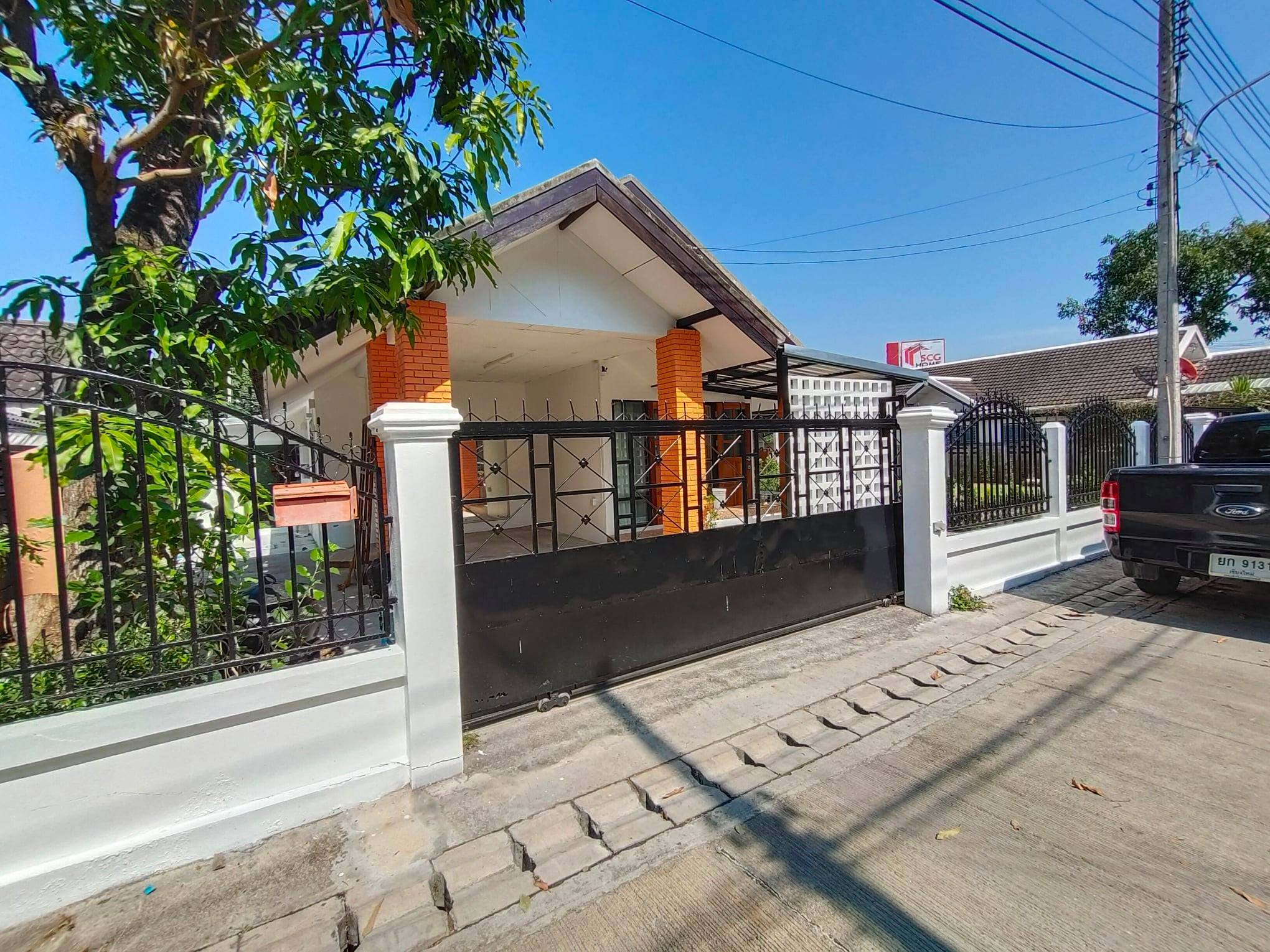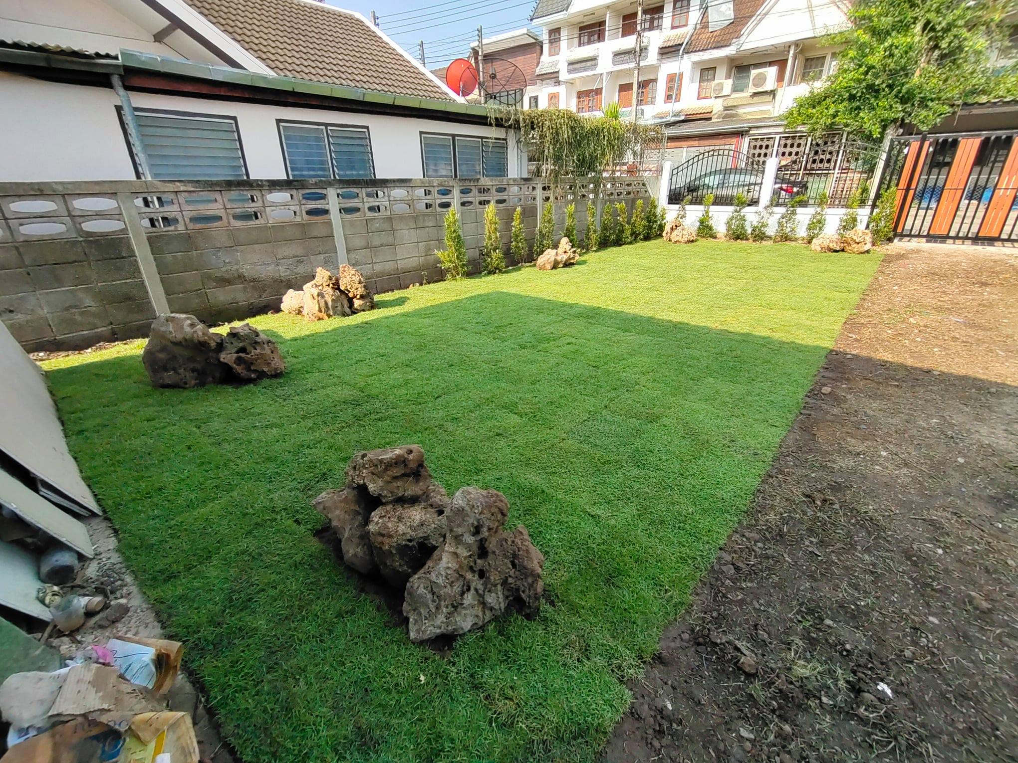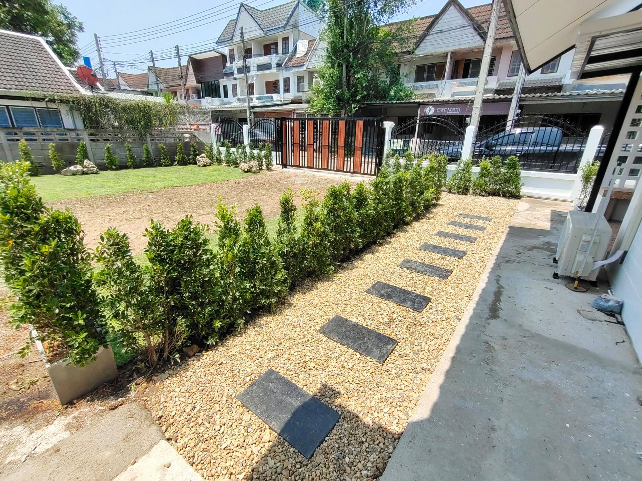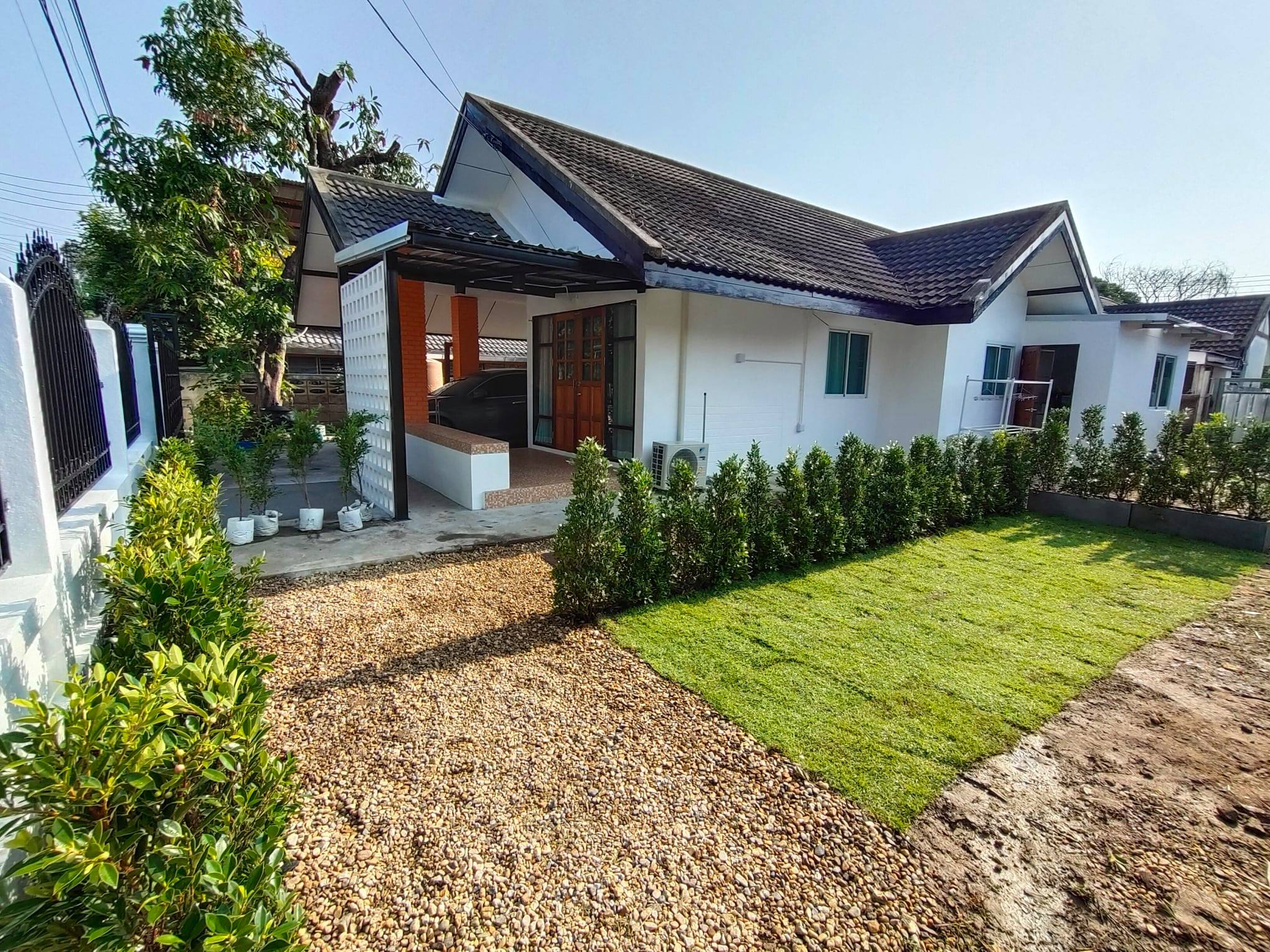 บริเวณหน้าบ้านถูกปูสนามด้วยหญ้าสีเขียวขจี ทำให้เป็นอีกมุมพักผ่อนนอกบ้านที่สวยงามสดชื่น เหมาะกับครอบครัวที่ต้องการพื้นที่ทำกิจกรรมนอกบ้านโดยเฉพาะ