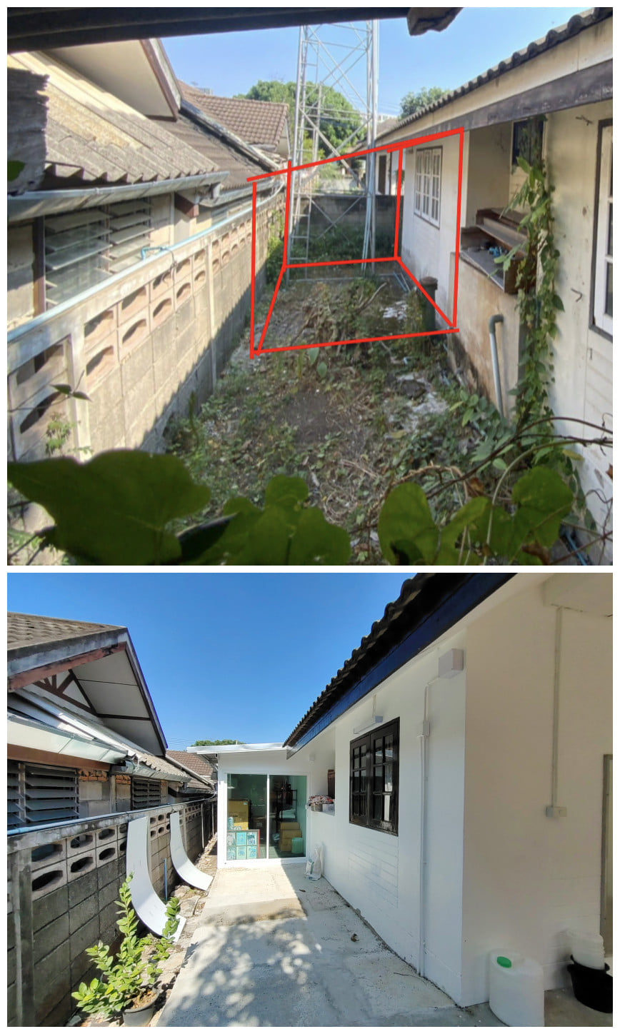 พื้นที่นี้ถูกต่อเติมขยายพื้นที่ให้เป็นห้องครัวใหม่ของบ้าน