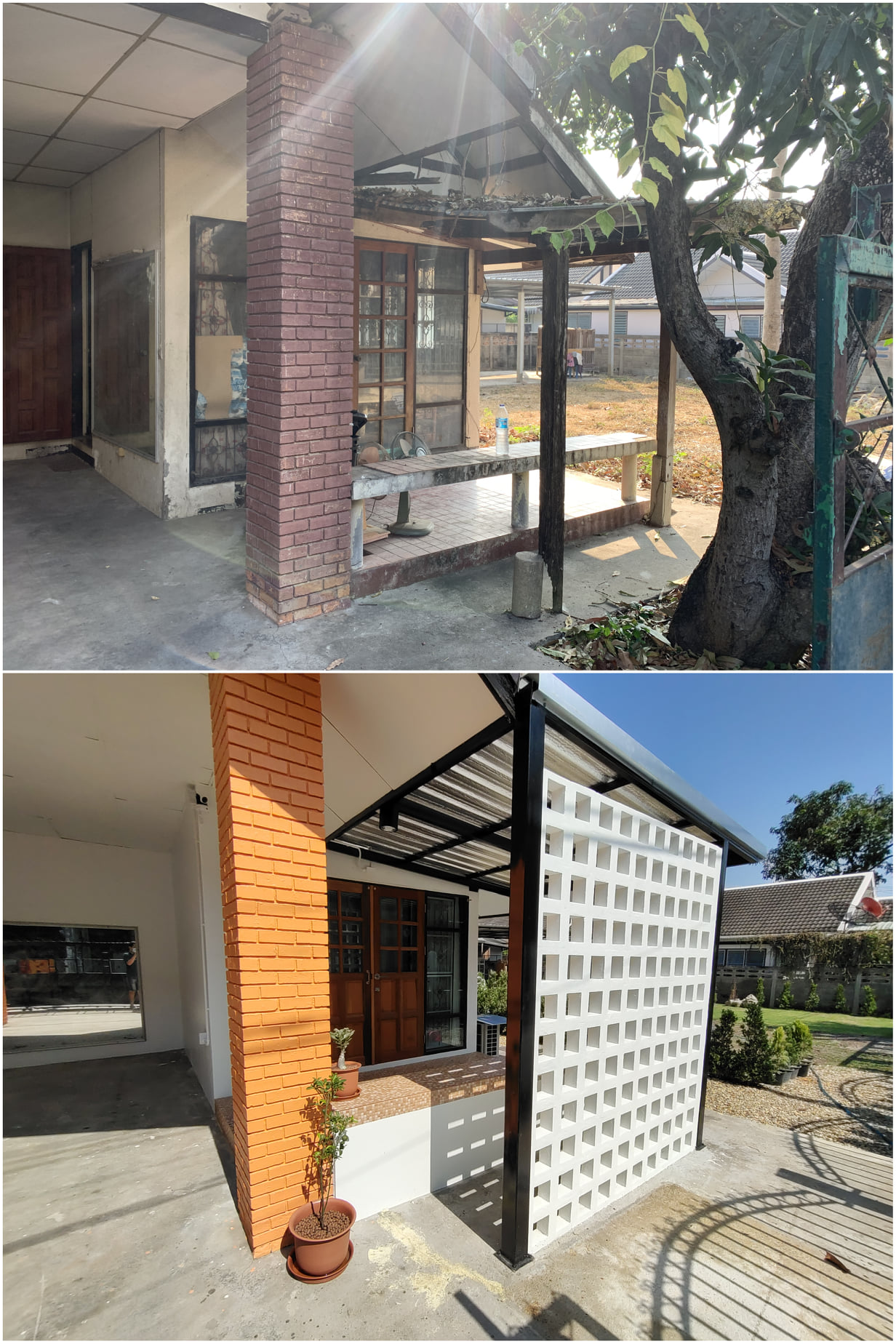 เฉลียงพักผ่อนหน้าบ้านถูกต่อเติมช่องลมช่วยลดแสงที่สาดเข้าสู่บ้าน