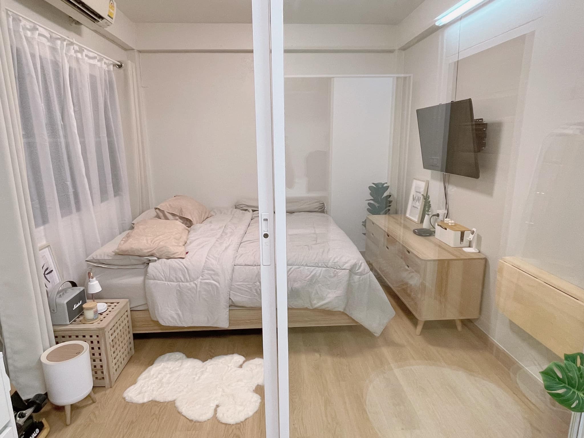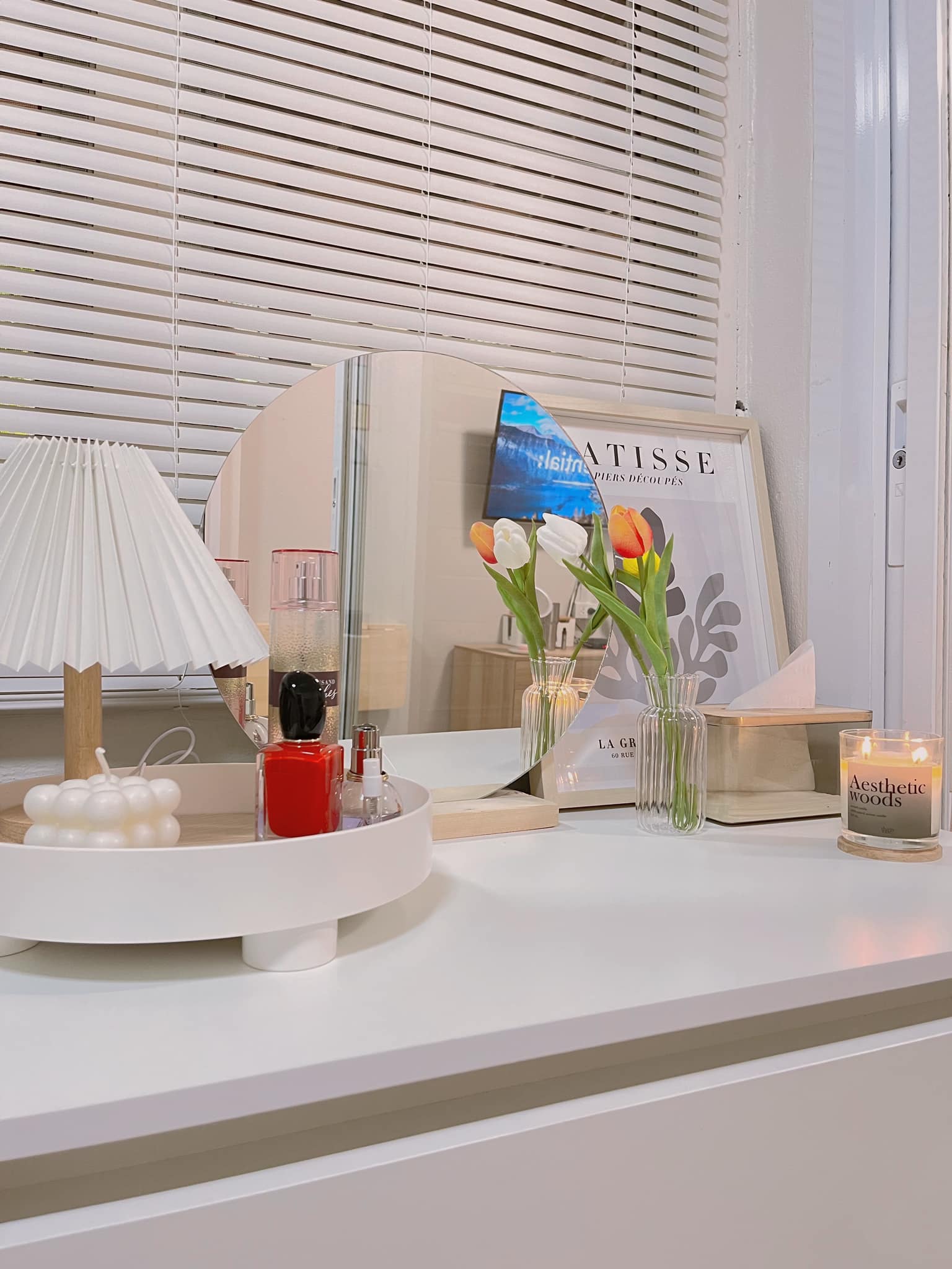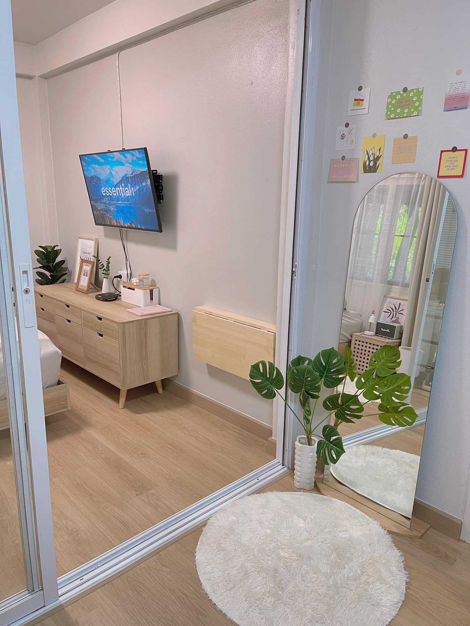 บริเวณหน้าห้องนอน เจ้าของห้องเอากระจกเงาพร้อมกับต้นไม้มาวางเอาไว้เพื่อการตกแต่ง โดยกระจกเงายังมีประโยชน์ในแง่ของการช่วยเพิ่มมิติ ทำให้ห้องดูกว้างมากขึ้นอีกด้วย