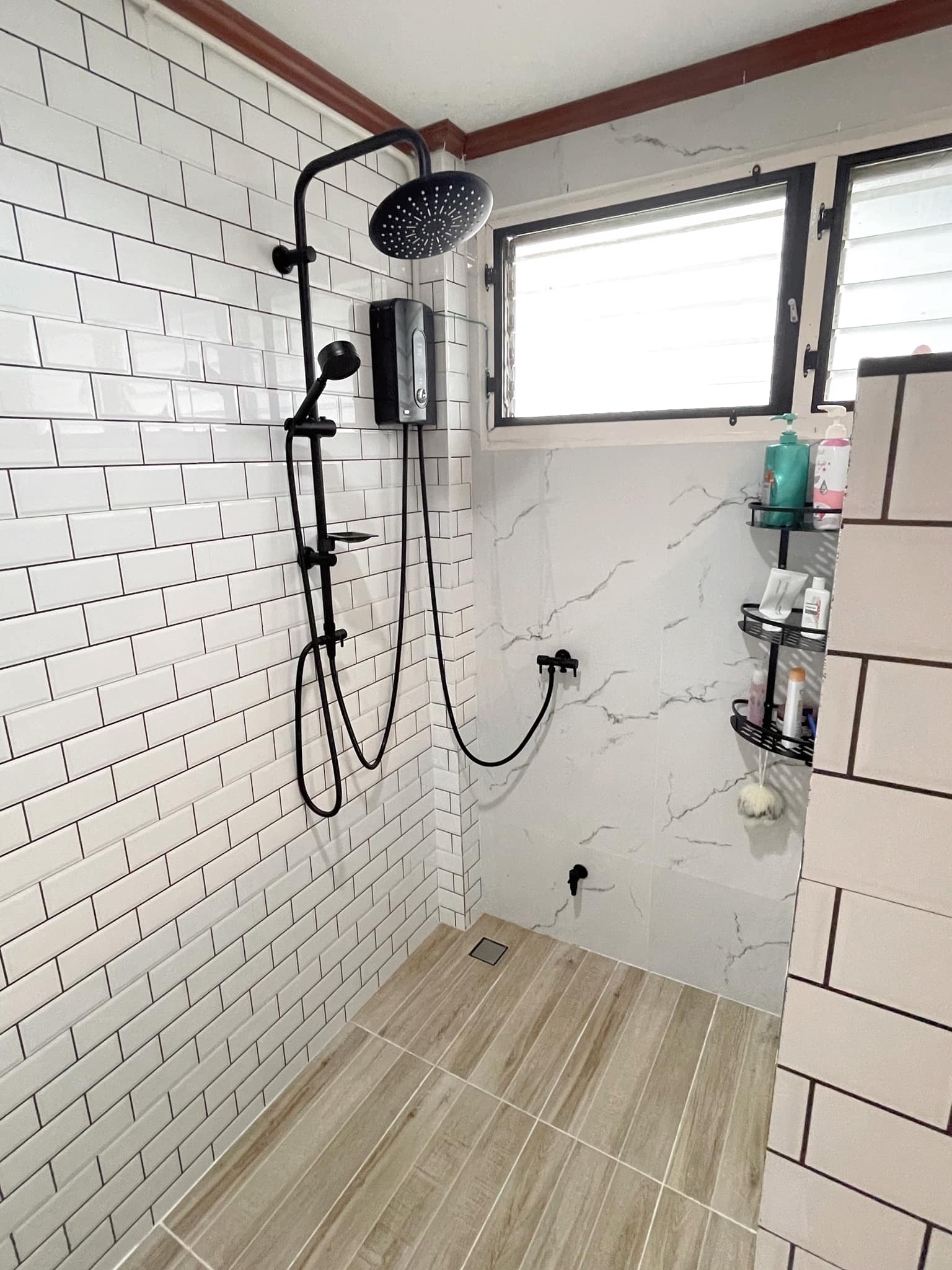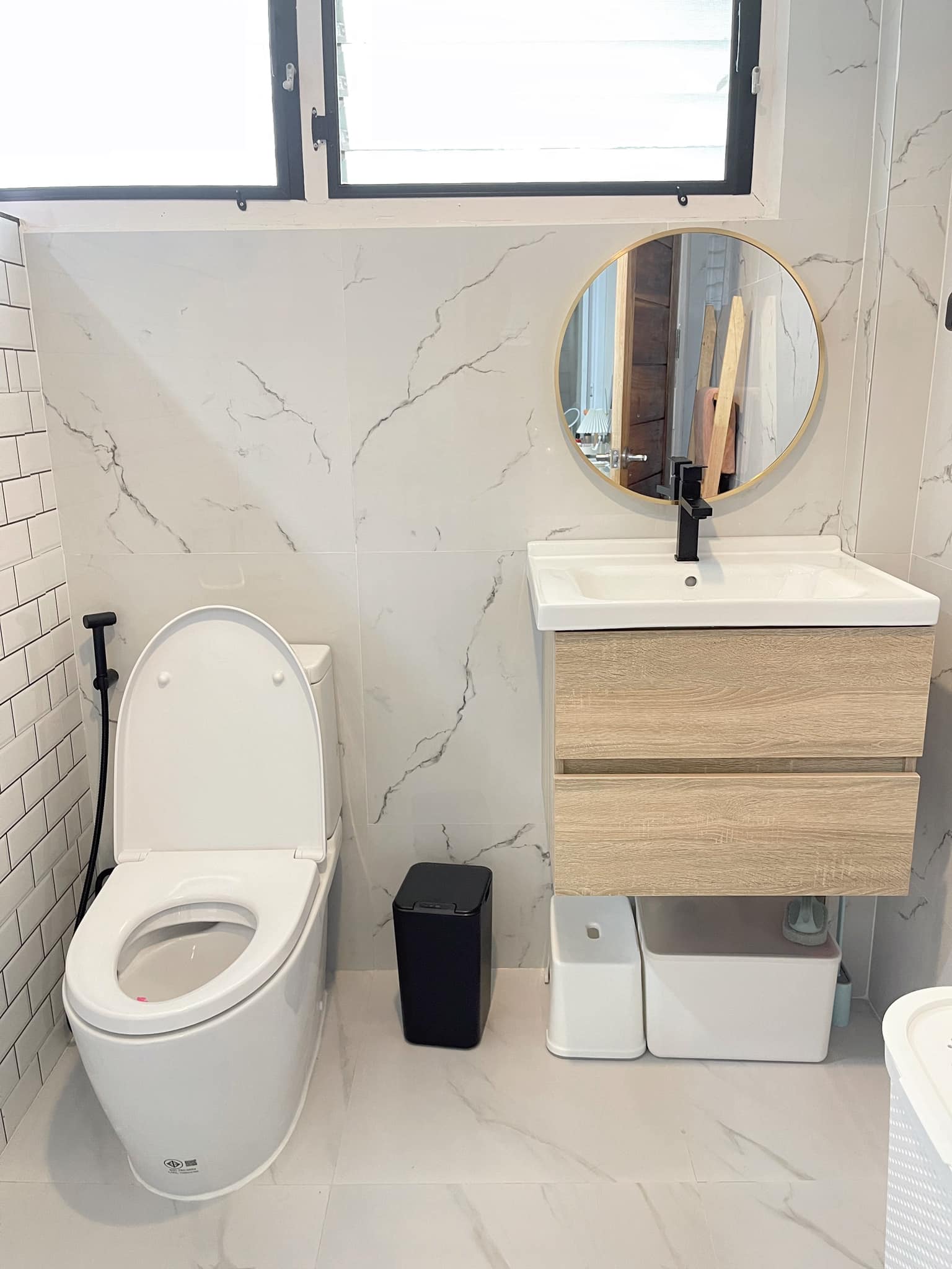 ภายในห้องน้ำก็จะมีรายละเอียดการตกแต่งที่เรียบง่าย เช่นเดียวกับส่วนอื่น ๆ ของห้อง แต่จุดที่น่าสนใจก็คือ ผนังห้อง ซึ่งเป็นกระเบื้องลายหินอ่อน จึงให้กลิ่นอายที่ดูหรูหรามากยิ่งขึ้น