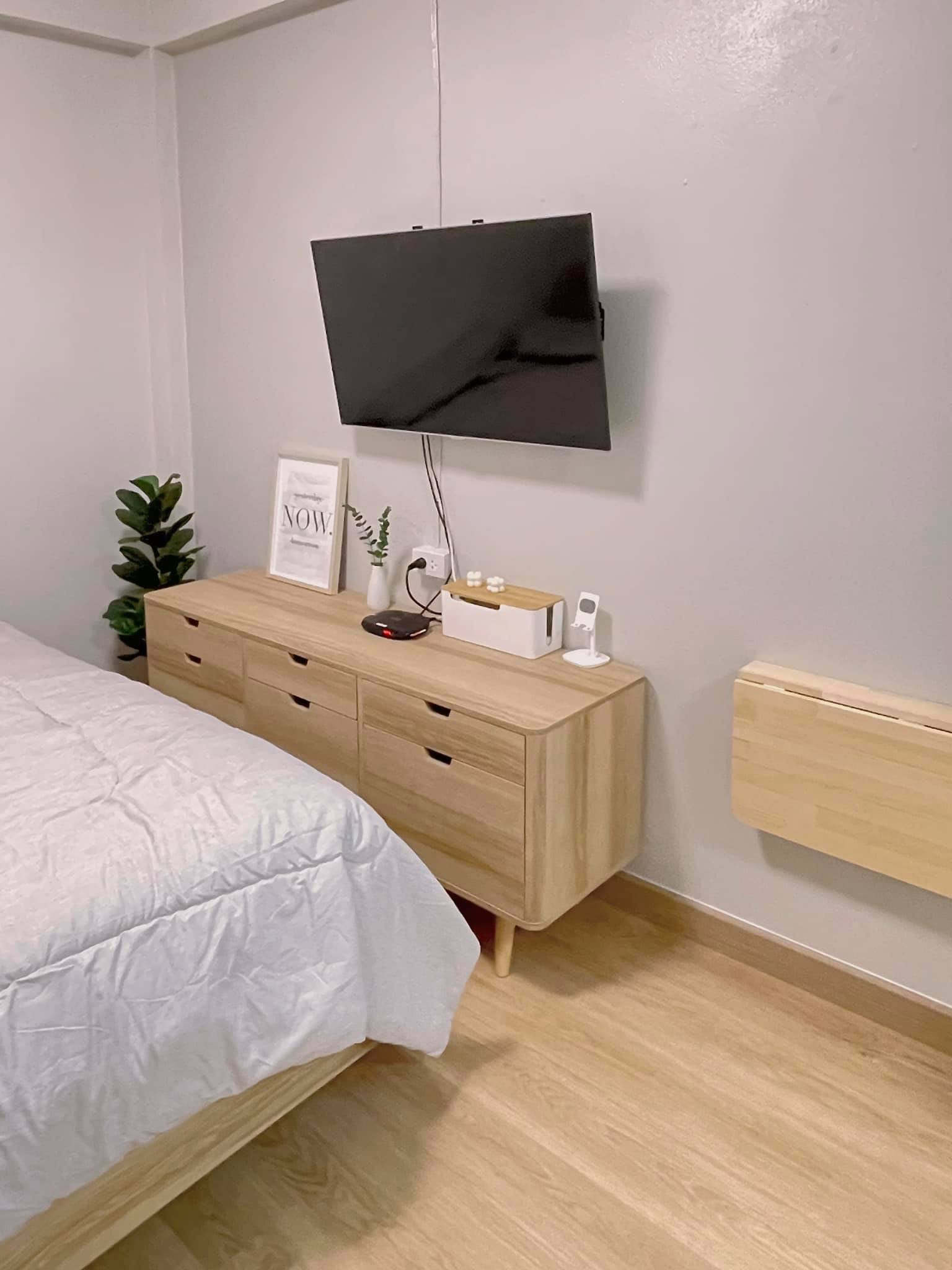 เฟอร์นิเจอร์ส่วนใหญ่ที่เจ้าของเลือกใช้ก็จะเป็นเฟอร์นิเจอร์ไม้เป็นหลัก เพราะทั้งดีไซน์ที่เรียบง่ายและโทนสีที่อบอุ่น ก็เข้าธีมของห้องได้เป็นอย่างดี