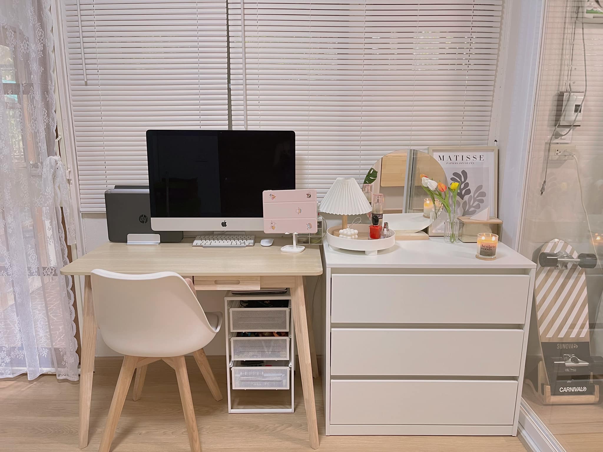 สำหรับมุมนี้จะเป็นมุมสำหรับการทำงาน โดยจะแบ่งพื้นที่เอาไว้ใช้อย่างเป็นสัดส่วน อีกทั้งเราจะเห็นได้ว่าเจ้าของห้องมีอุปกรณ์ที่ช่วยอำนวยความสะดวกให้กับการทำงานอย่างครบครัน