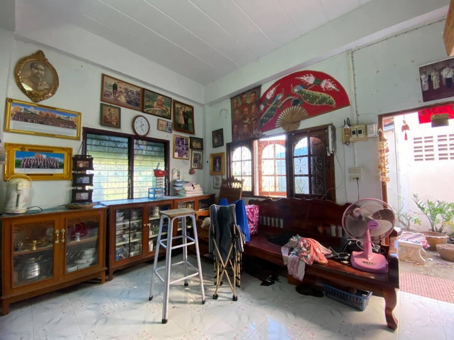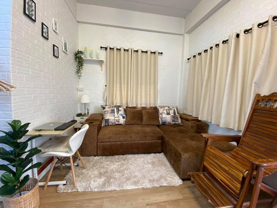 มุมนี้เป็นพื้นที่หลังของห้อง โดยได้เลือกตกแต่งด้วยชุดโซฟาตัวใหญ่โทนสีน้ำตาลเข้ม พร้อมกับการปูพื้นห้องด้วยพรมแบบขนนุ่มนิ่ม