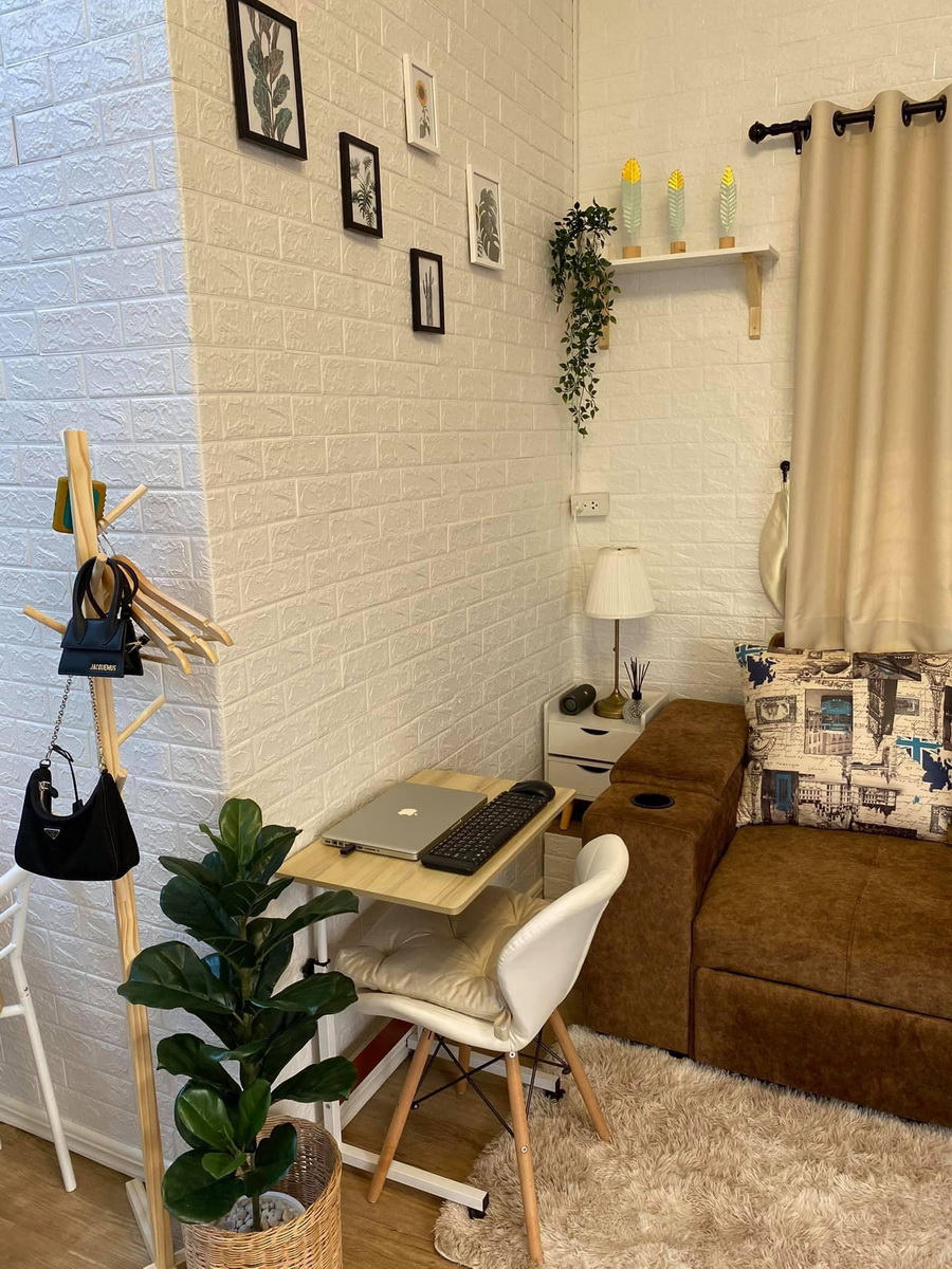 มุมโต๊ะทำงานเล็ก ๆ ที่ติดกับผนังวอลล์เปเปอร์สีขาว ภายในมุมนี้ยังมีการตกแต่งด้วยเฟอร์นิเจอร์และของตกแต่งที่หลากหลายอีกด้วย