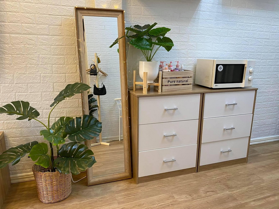 สำหรับมุมนี้จะเป็นมุมสำหรับการแต่งตัว โดยจะมีกระจกเงาบานใหญ่ที่ประดับด้วยไฟสาย รวมไปถึงต้นไม้ที่ให้ความสดชื่นสบายตา