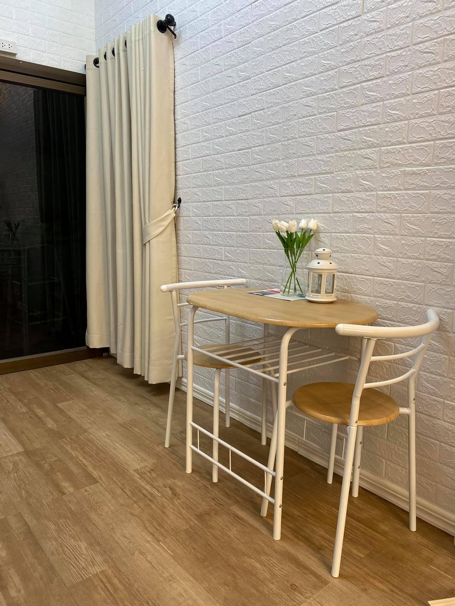 บริเวณนี้ถูตกแต่งด้วยชุดโต๊ะขนาดเล็กในโทนสีน้ำตาลอ่อน ซึ่งก็เข้ากันดีกับผนังวอลล์เปเปอร์สีขาวของบ้าน เป็นมุมเพื่อการรับประทานอาหารที่น่ารักสุด ๆ