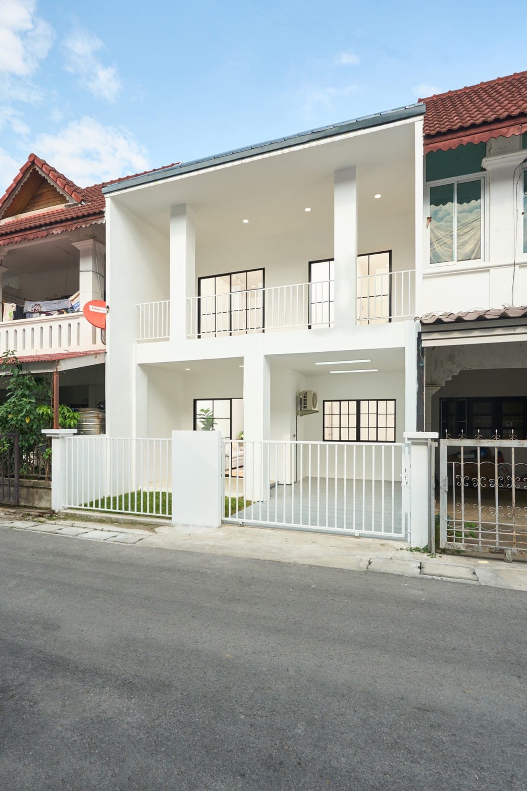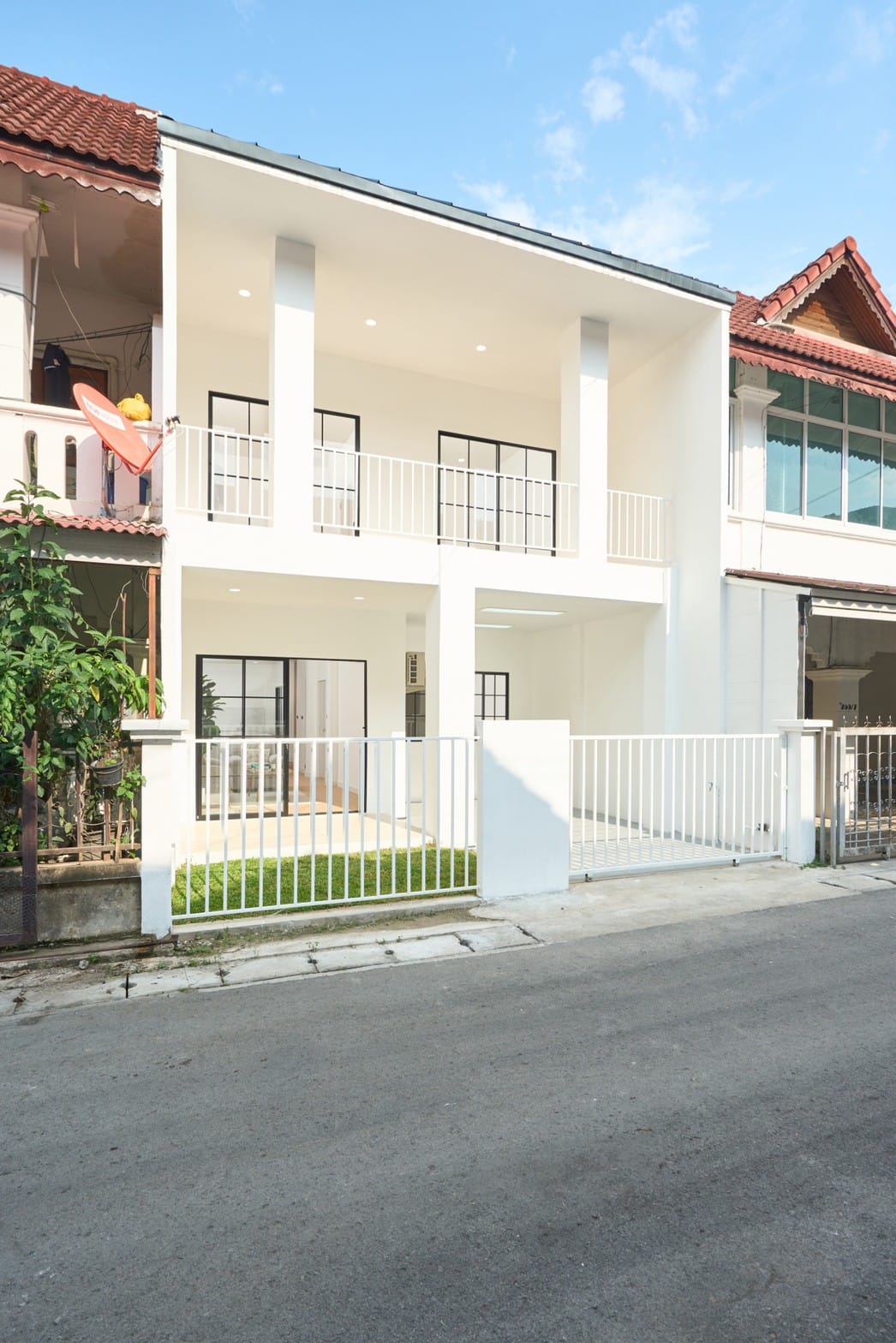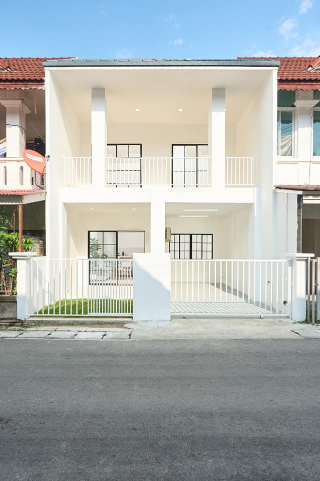 องค์ประกอบเดิม ๆ ยังคงอยู่ครบ ทั้งที่จอดรถ ลานโล่งหน้าบ้าน รวมไปถึงระเบียงชั้นบน และโทนสีขาวของบ้านที่ตกแต่งใหม่ ก็ทำให้บ้านดูมีเสน่ห์มากเลยล่ะ