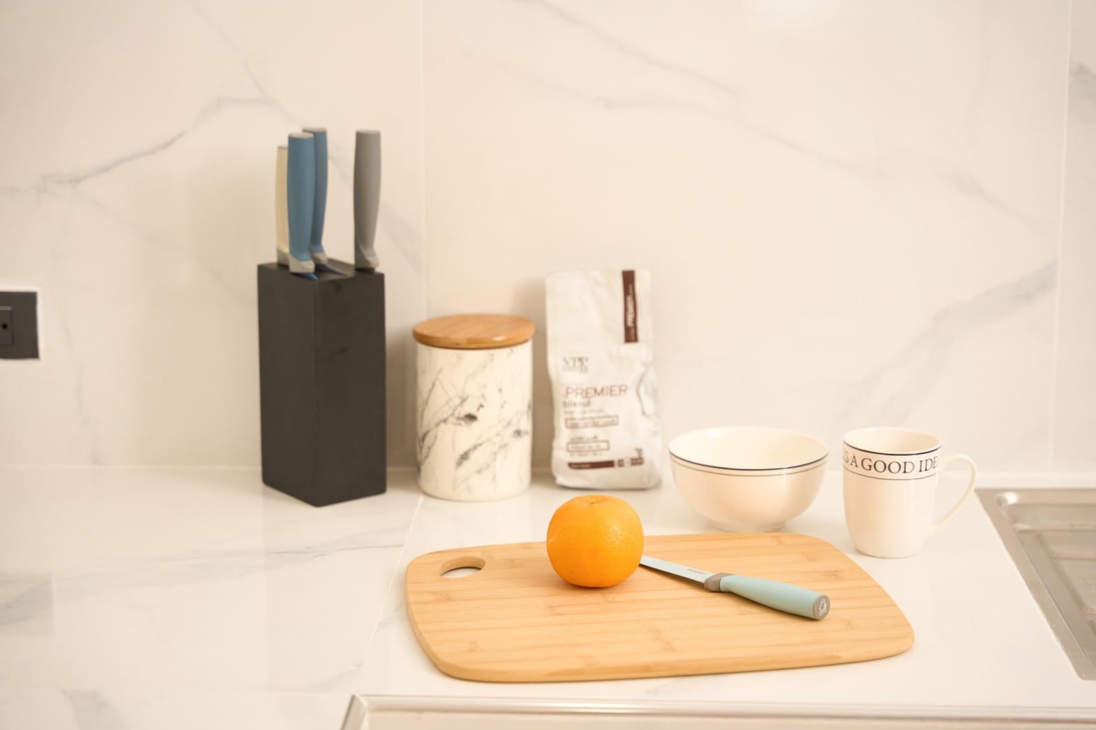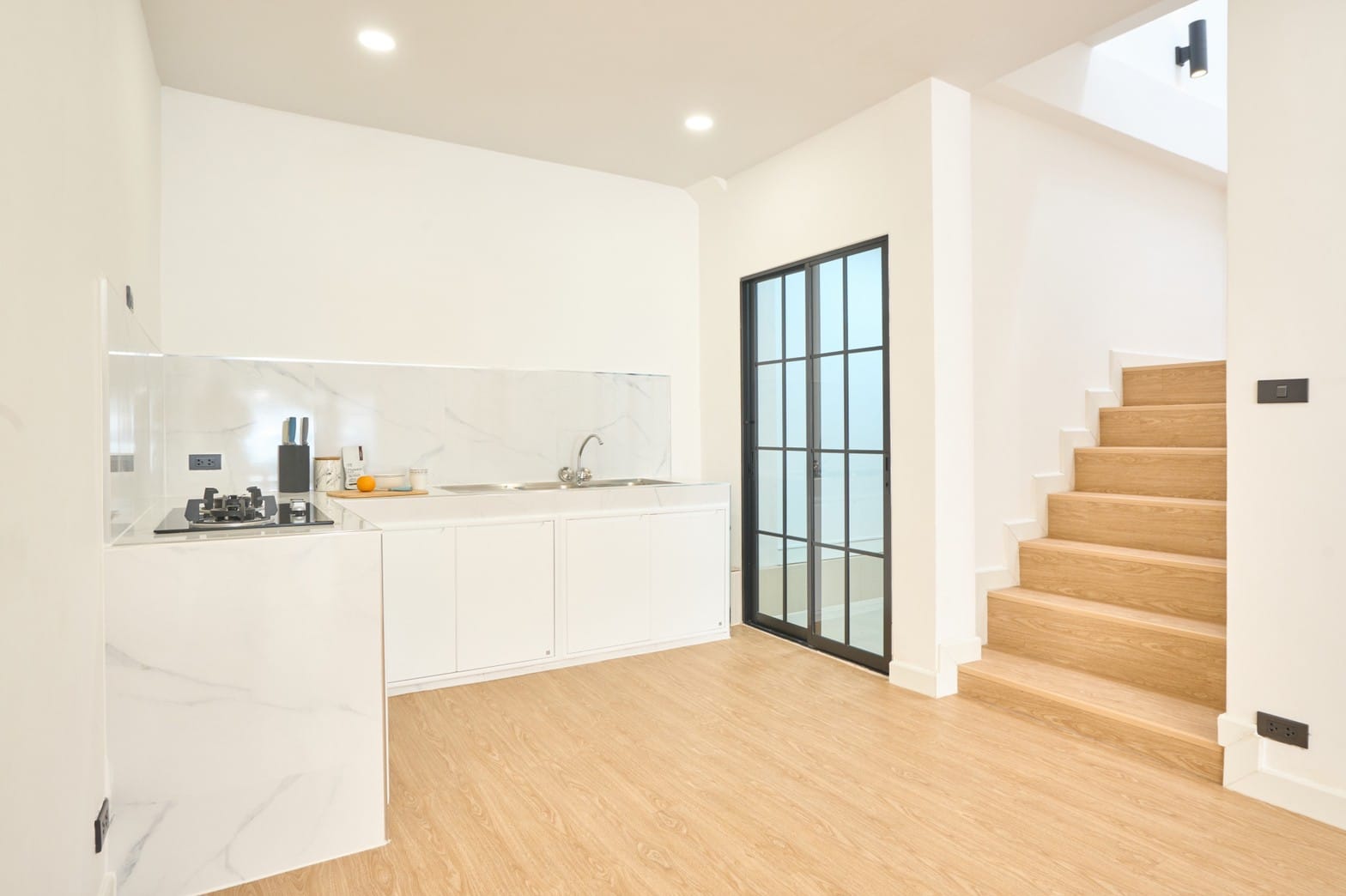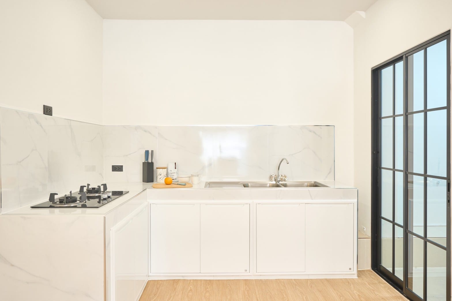 ภายในห้องครัวจะมีความเป็นโมเดิร์นมากขึ้น เพื่อให้สามารถใช้งานได้สะดวก แต่ธีมการตกแต่งจะยังคงมีบรรยากาศที่สบายตาแบบมินิมอล