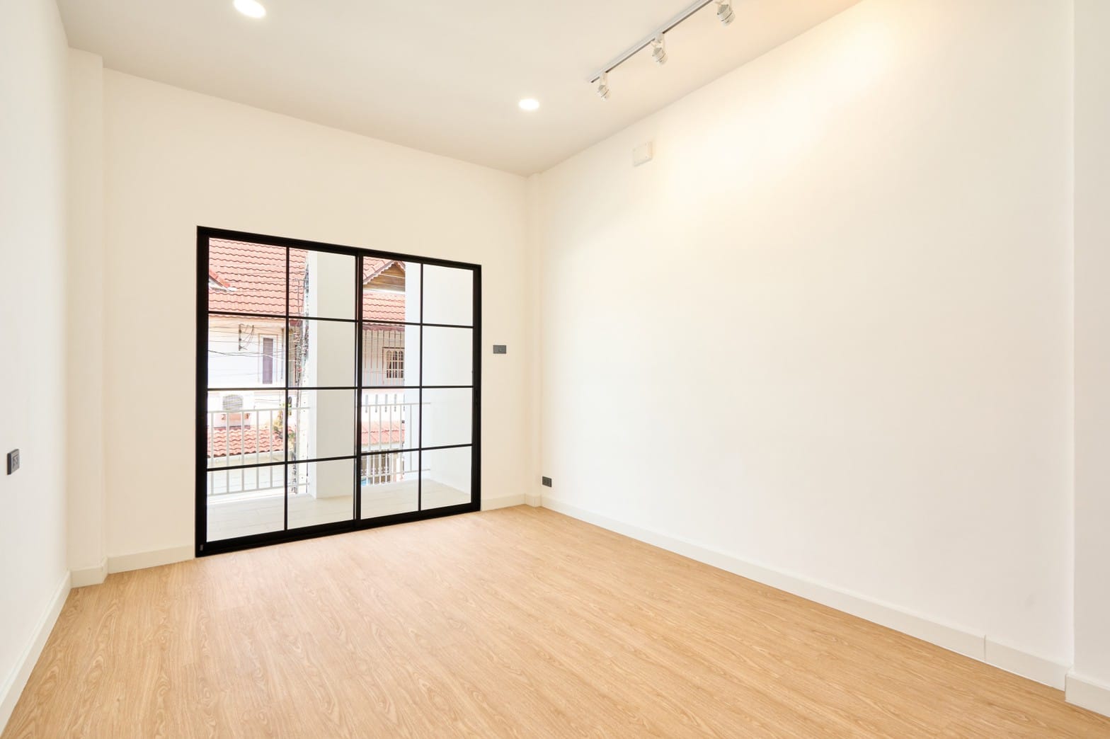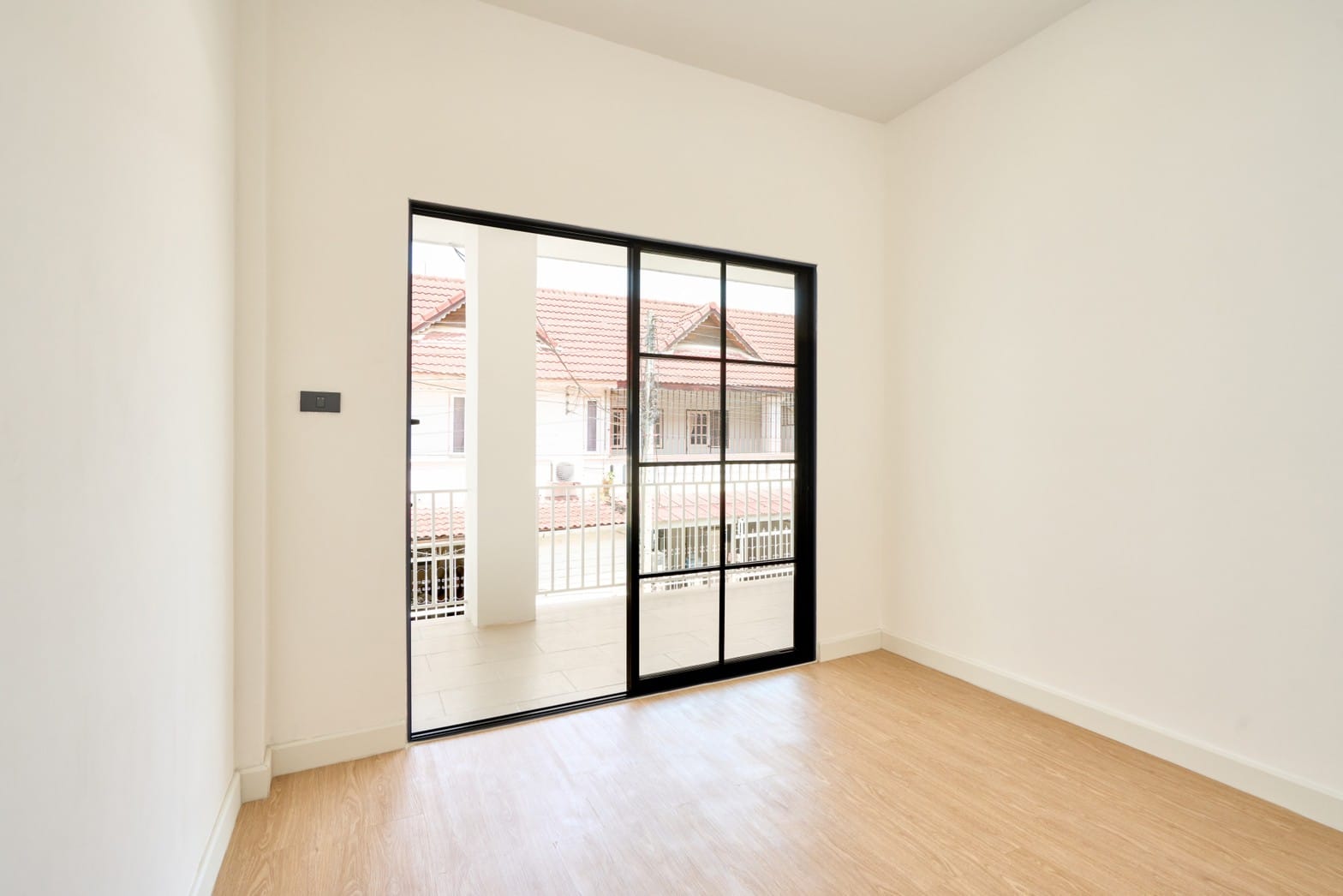 อย่างห้องนี้จะพิเศษตรงที่ได้เพิ่มประตูระเบียง ซึ่งเป็นกรอบสี่เหลี่ยมขนาดใหญ่สีดำที่เข้ากันดีกับห้องนอนเรียบ ๆ แบบนี้