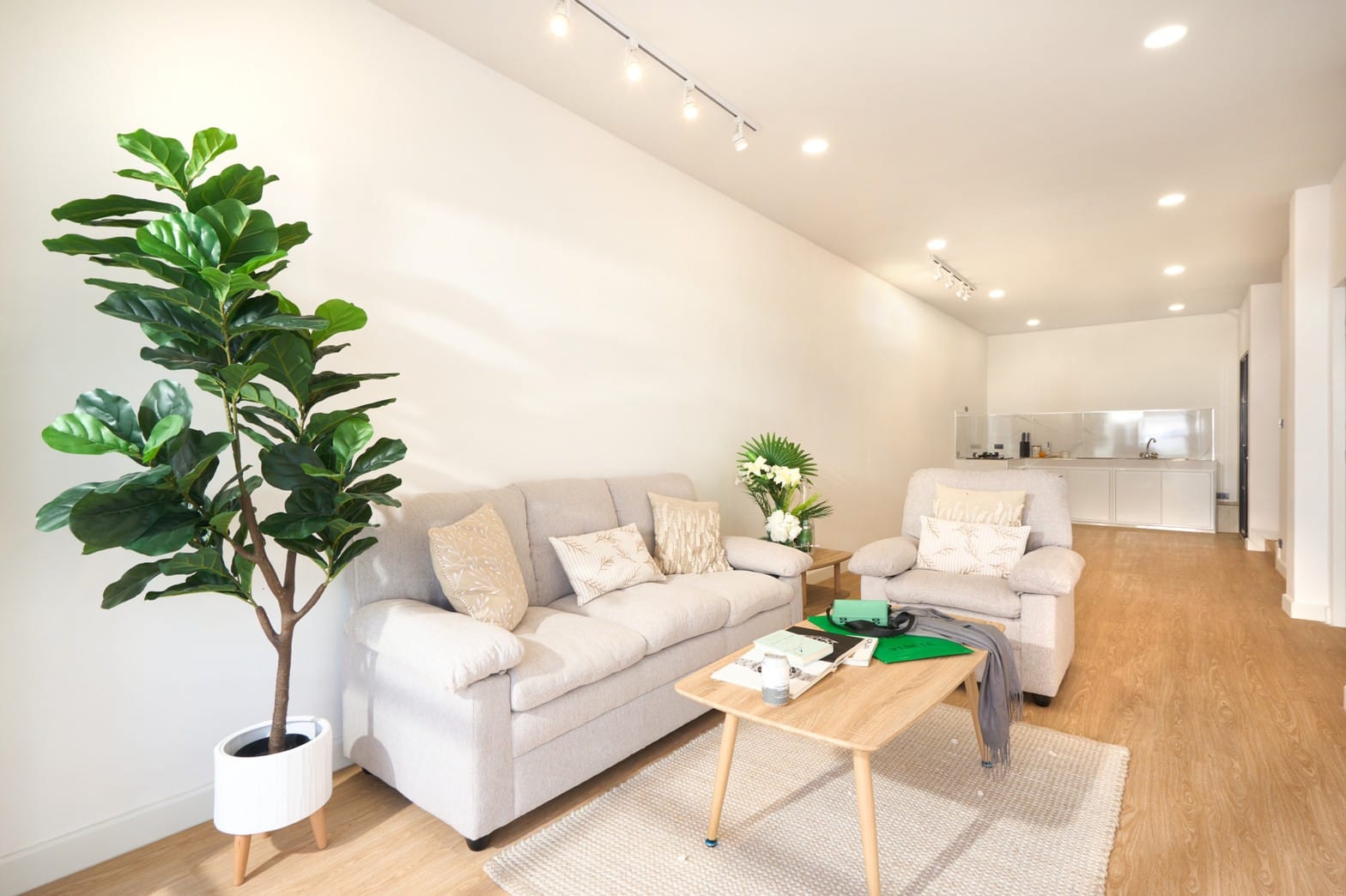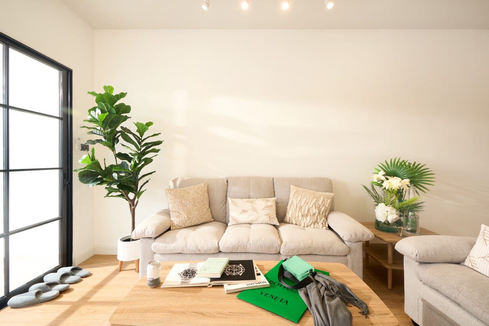 ทีนี้ เราลองมาชมด้านในบ้านกันบ้าน ภายในบ้านจะตกแต่งในสไตล์มินิมอล ผนังและพื้นจะใช้โทนสีอ่อนทั้งสีครีมและสีน้ำตาล เฟอร์นิเจอร์อื่น ๆ ก็จะเป็นสีแบบเอิร์ธโทนที่เข้ากันสุด ๆ