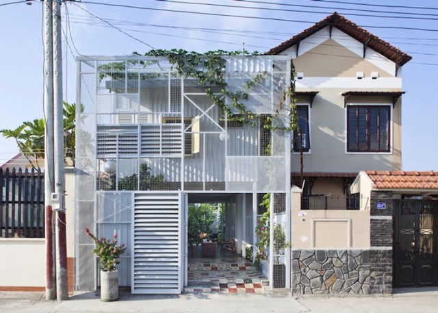 ตัวบ้านติดริมถนน ออกแบบให้ใกล้ชิดกับถนน เนื่องจากมีพื้นที่ที่จำกัด ตกแต่งผนังหินเป็นแนวรั้ว รวมทั้งผนังจากระแนงเหล็กตกแต่งที่หน้าบ้าน เว้นช่องให้เป็นทางเข้าบ้าน และที่จอดรถเล็กน้อย