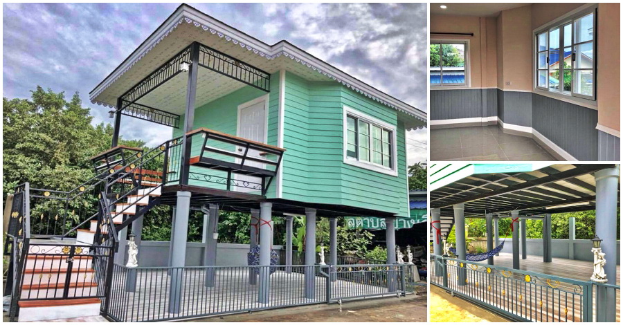ลักษณะบ้านชั้นเดียว ดีไซน์บ้านด้วยสไตล์คอจเทจ ผนังภายนอกตกแต่งด้วยโทนสีเขียวมิ้นต์สีสันสวยงาม นอกจากนี้บ้านหลังนี้ยังออกแบบตัวบ้านมีใต้ถุนที่ยกสูง ให้บรรยากาศที่โปร่งโล่ง