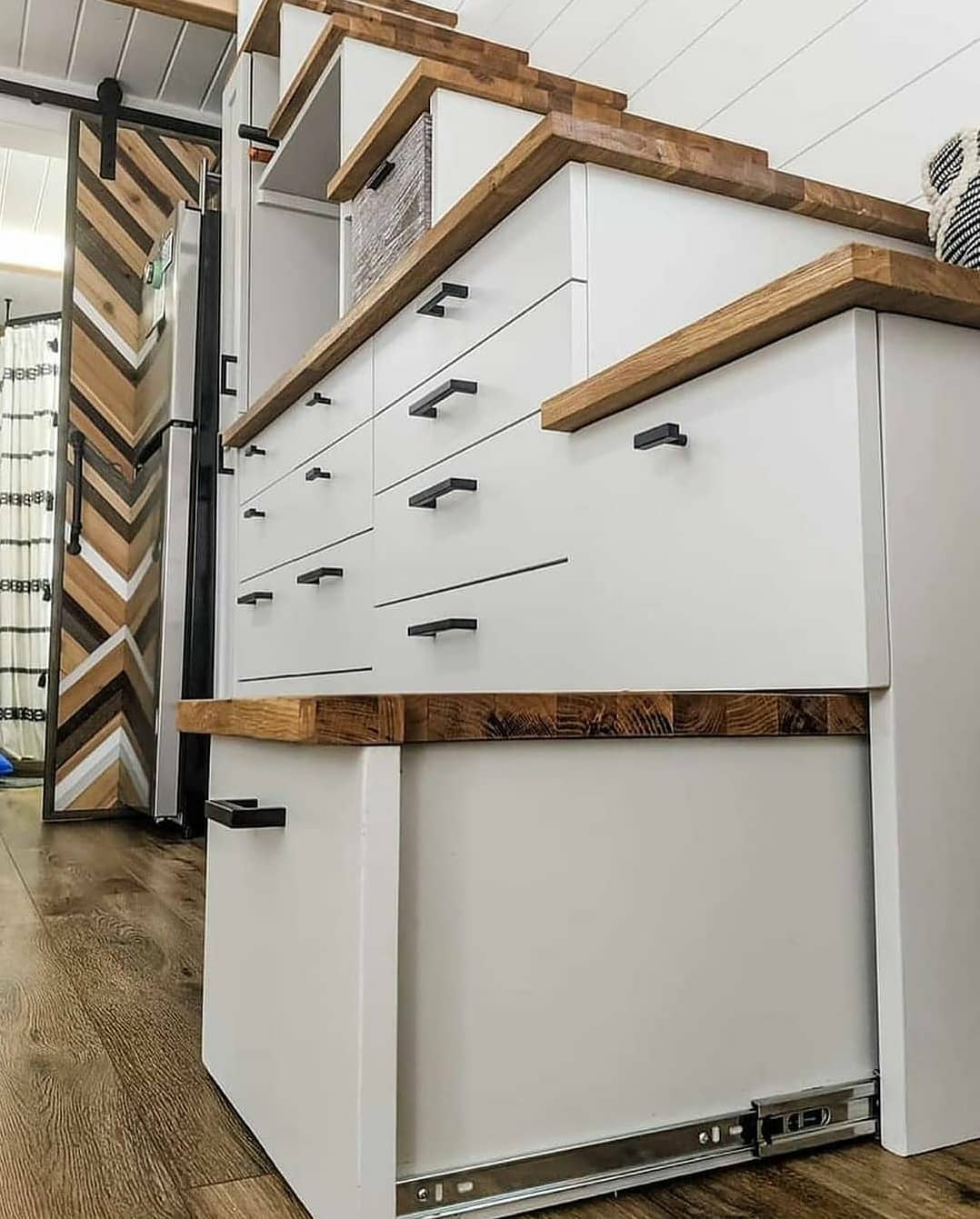 บันไดที่เชื่อมไปยังชั้นลอย ถูกออกแบบให้มีตู้ลิ้นชักเล็ก ๆ ให้ใช้งานด้วย จึงเป็นการออกแบบที่ชาญฉลาด สามารถใช้ประโยชน์จากพื้นที่ได้อย่างคุ้มค่า