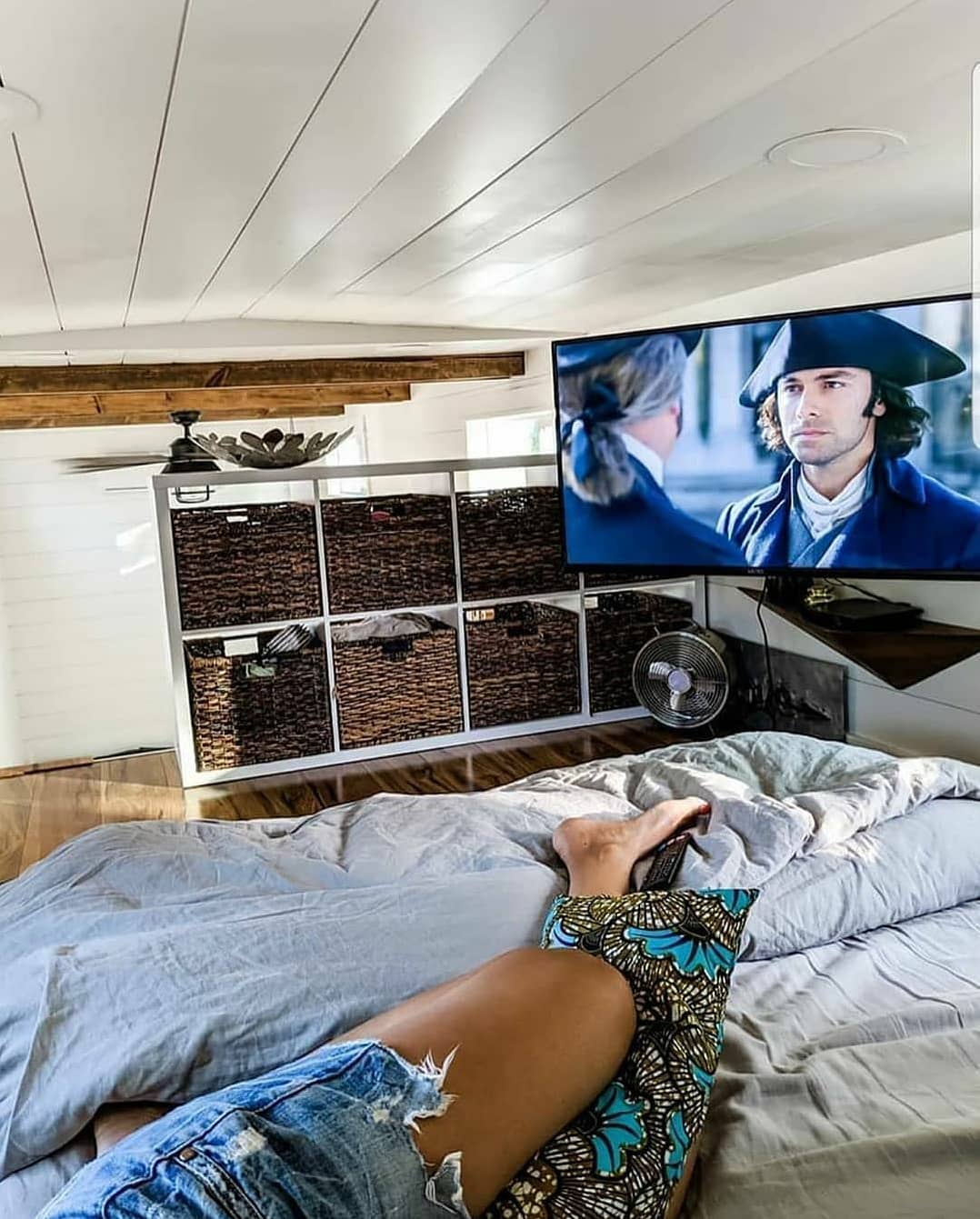 บนพื้นที่ชั้นลอย เป็นห้องนอนเล็ก ๆ ที่ตกแต่งอย่างเรียบง่าย ที่น้อยจะปูด้วยฟูกง่าย ๆ มีชั้นวางกับกล่องถูกใช้เป็นฉากกั้นไปด้วยในตัว จึงมีความเป็นส่วนตัวขึ้นมาอีกนิด