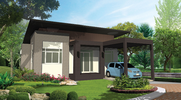 ตัวบ้านขนาดชั้นเดียว ก่อสร้างจากวัสดุคอนกรีต ภายนอกตกแต่งด้วยโทนสีดำ คุมโทนสีเทา ขาว และน้ำตาลเข้ม หลังคาเลือกใช้ทรงเพิงหมาแหงน พื้นที่ด้านหน้ามีโรงจอดรถใต้ชายคาในตัว มีสวนหย่อมเล็กๆ เพิ่มความสดชื่นและกลิ่นอายธรรมชาติให้กับตัวบ้านโทนสีทึบ