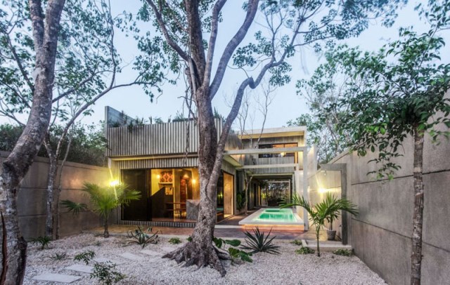 บ้านโครงสร้างคอนกรีต ออกแบบรูปทรงกล่อง ใช้หลังคาเพิงหมาแหงนที่ยื่นยาวแบบบ้านสมัยใหม่ สวยงามไปกับผนังไม้ตีชิดในแนวตั้งที่ตกแต่งอยู่ กระจก โลหะ ถูกนำมาเติมแต่งให้แก่ตัวบ้านได้สวยงามแบบบ้านสมัยใหม่ยิ่งขึ้น