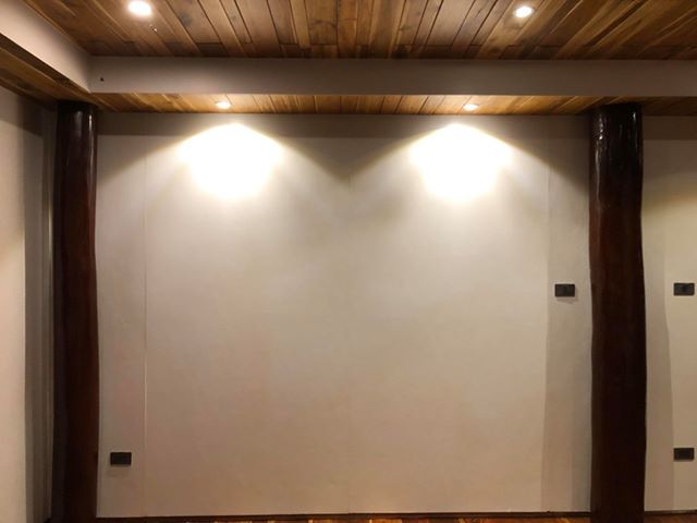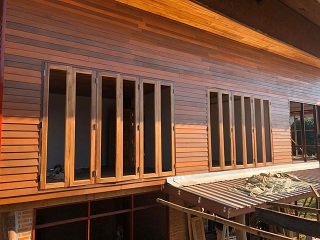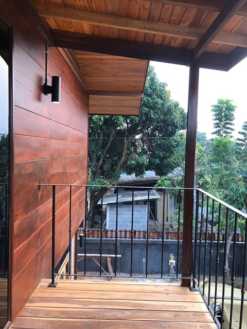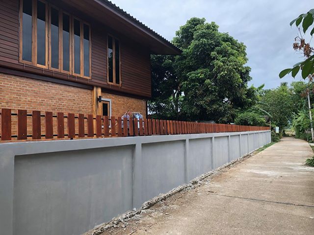 ชั้นล่างถูกออกแบบให้เป็นผนังอิฐเปลือย ส่วนชั้นบนเป็นผนังไม้