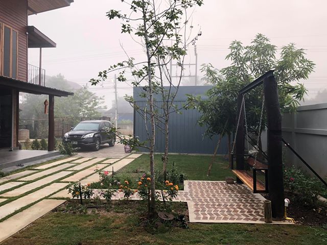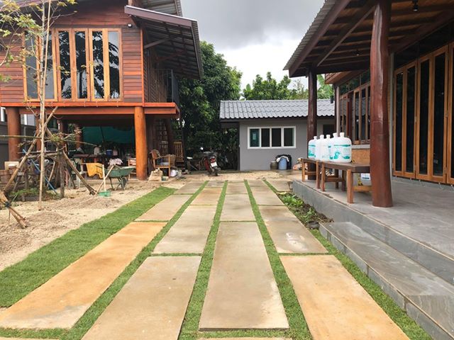 ปลูกหญ้าพร้อมแผ่นคอนกรีตทางเดินในสวนบริเวณรอบบ้าน เพิ่มความสดชื่นด้วยธรรมชาติ