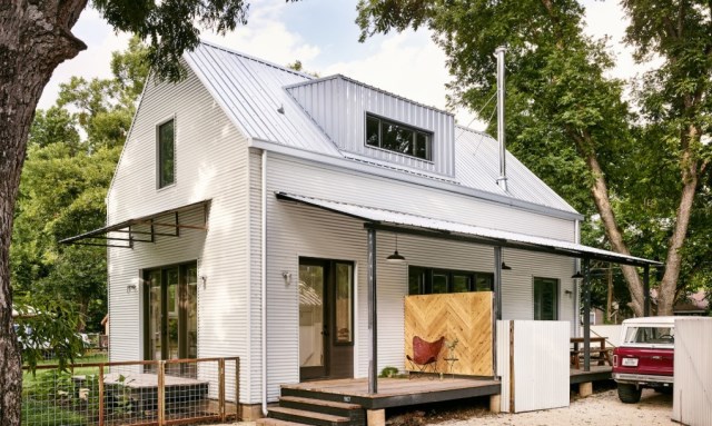 บ้านรูปทรงที่เรียบง่าย แบบสี่เหลี่ยม หลังคาจั่วที่คุ้นตาคนไทย และเข้ากับสภาพอากาศของบ้านเราได้ดีเยี่ยม ตกแต่งผนังด้วยสีขาว วัสดุจากเมทัลชีททั้งหลัง ดูเรียบง่าย น่ารักไปกับเฉลียงขนาดเล็กๆ รับกับฟังก์ชันก่อนเข้าบ้าน