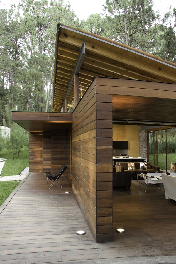 โครงสร้างบ้านทำจากไม้และหิน ออกแบบเป็นบ้านหน้ากว้าง เสริมชานบ้านอย่างทันสมัย ไว้รับชมบรรยากาศป่าไม้รอบๆ ตอกย้ำความทันสมัยด้วยหลังคาแบบเพิงหมาแหงน