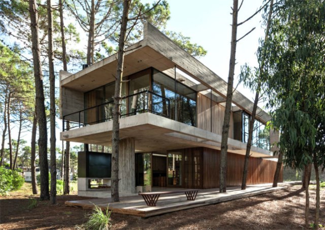 ตัวบ้านโครงสร้างคอนกรีต ออกแบบรูปทรงกล่อง มีส่วนที่หดยื่นตามสไตล์ของโมเดิร์น ปูนเปลือยถูกเลือกนำมาเป็นพระเอกของบ้าน ก่อสร้างให้เห็นได้ชัดตั้งแต่ไกล ผสมงานกระจกตามช่องแสงช่องเปิดของตัวบ้าน ตอกย้ำความเป็นสมัยใหม่ได้ดีที่สุด