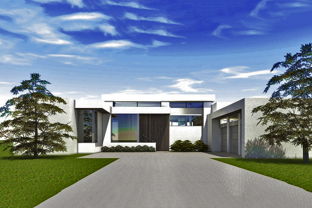 ออกแบบรูปทรงของบ้านที่เรียบ หน้ากว้าง บ้านทรงกล่อง สไตล์โมเดิร์น ออกแบบในแนวราบ ผนังคอนกรีตโทนสีขาวล้วนทั้งหลัง