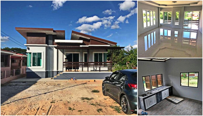 บ้านสไตล์โมเดิร์นชั้นเดียว 3 ห้องนอน 2 ห้องน้ำ ห้องโถงกลาง ห้องครัว และเฉลียงหน้าบ้าน มีพื้นที่ใช้สอย 158 ตารางเมตร ใช้งบประมาณในการก่อสร้าง 1.25 ล้านบาท (ไม่รวมเฟอร์นิเจอร์) เพื่อนๆ ชาวเว็บท่านไหนที่ชื่นชอบแบบบ้านสไตล์นี้ ก็ลองนำไอเดียไปปรับใช้กันได้นะคะ